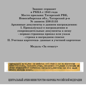 отделения, сержант 239 стрелковой дивизии. Медаль «За отвагу», «За взятие Кенигсберга»,