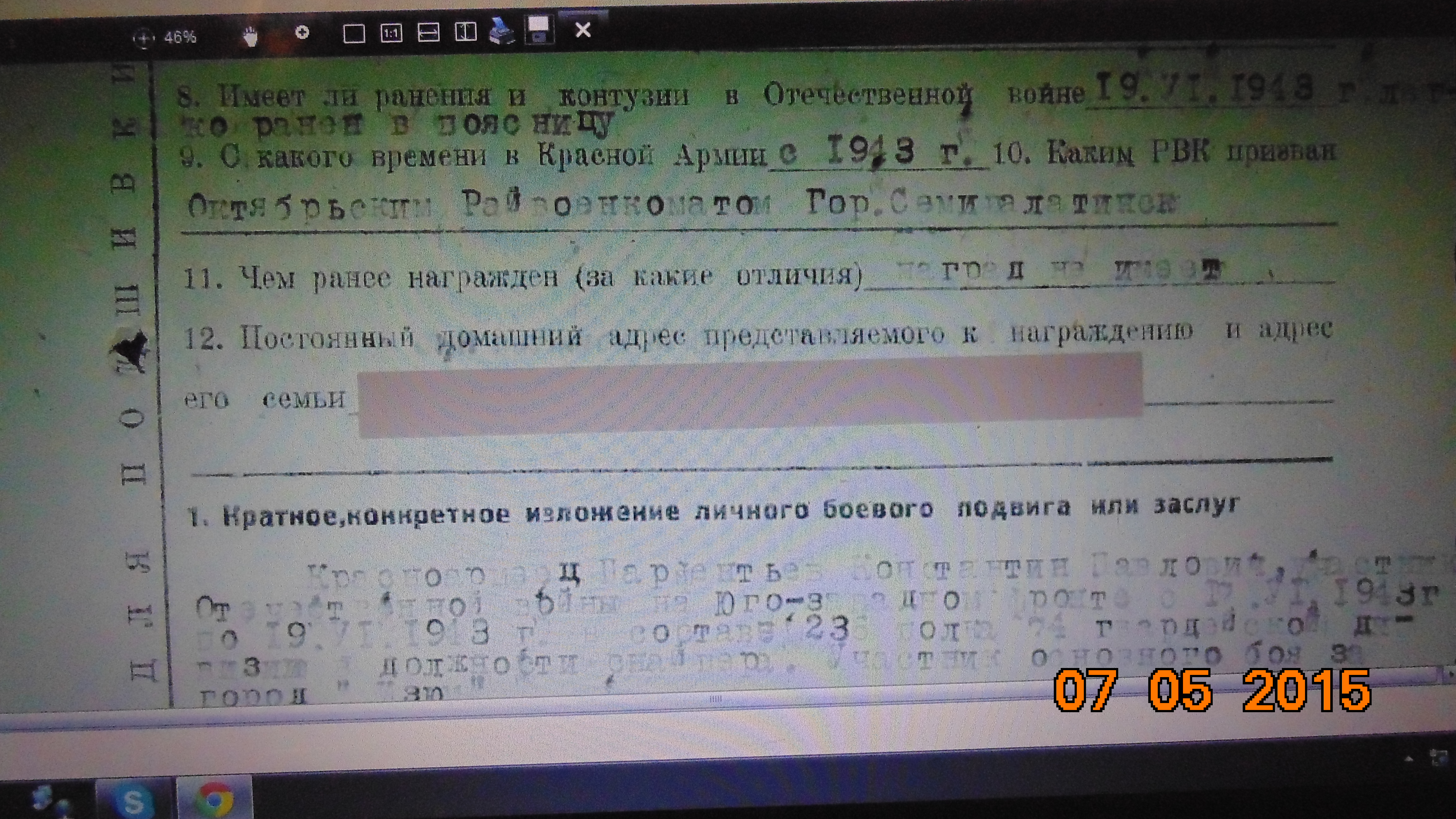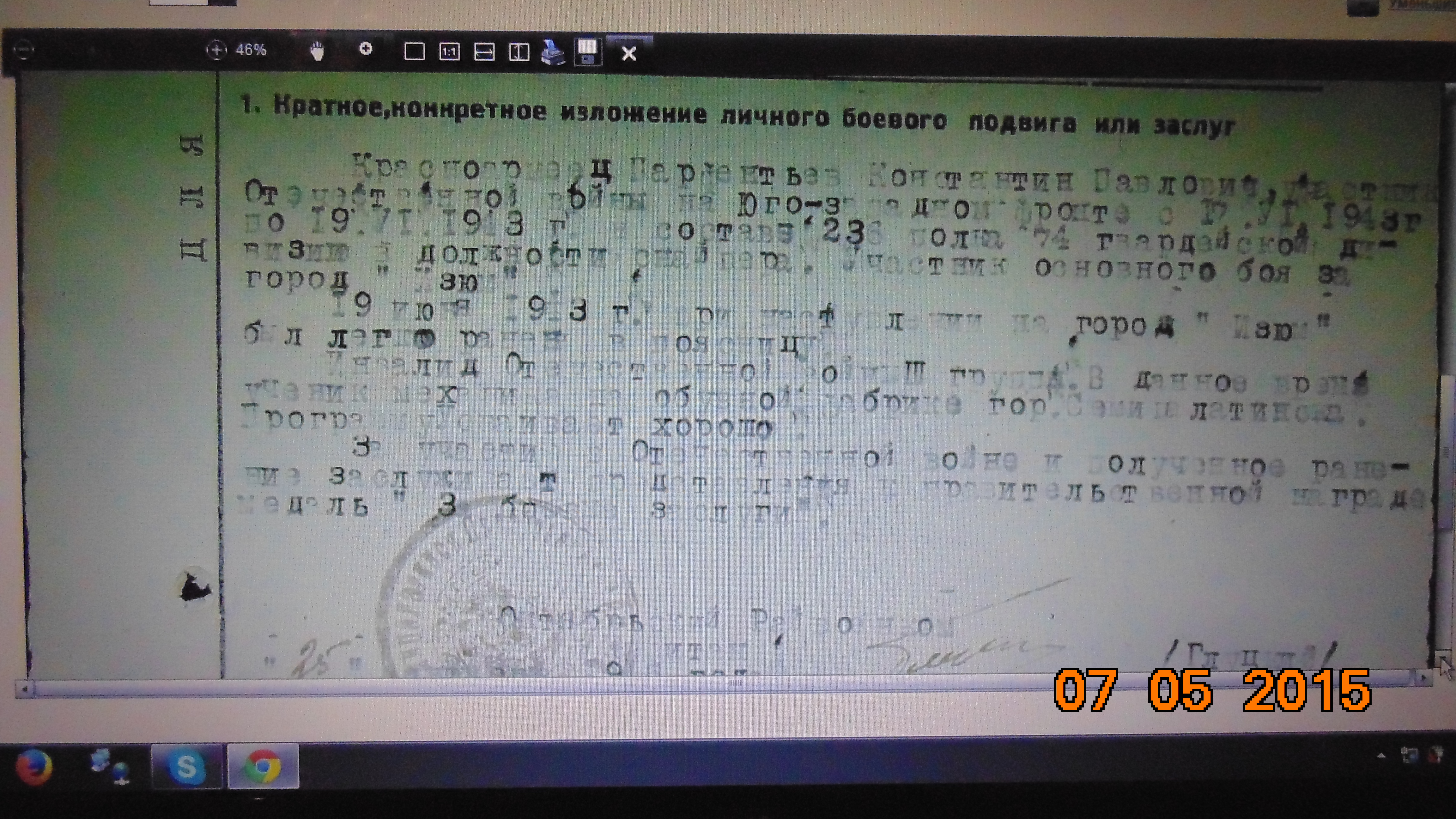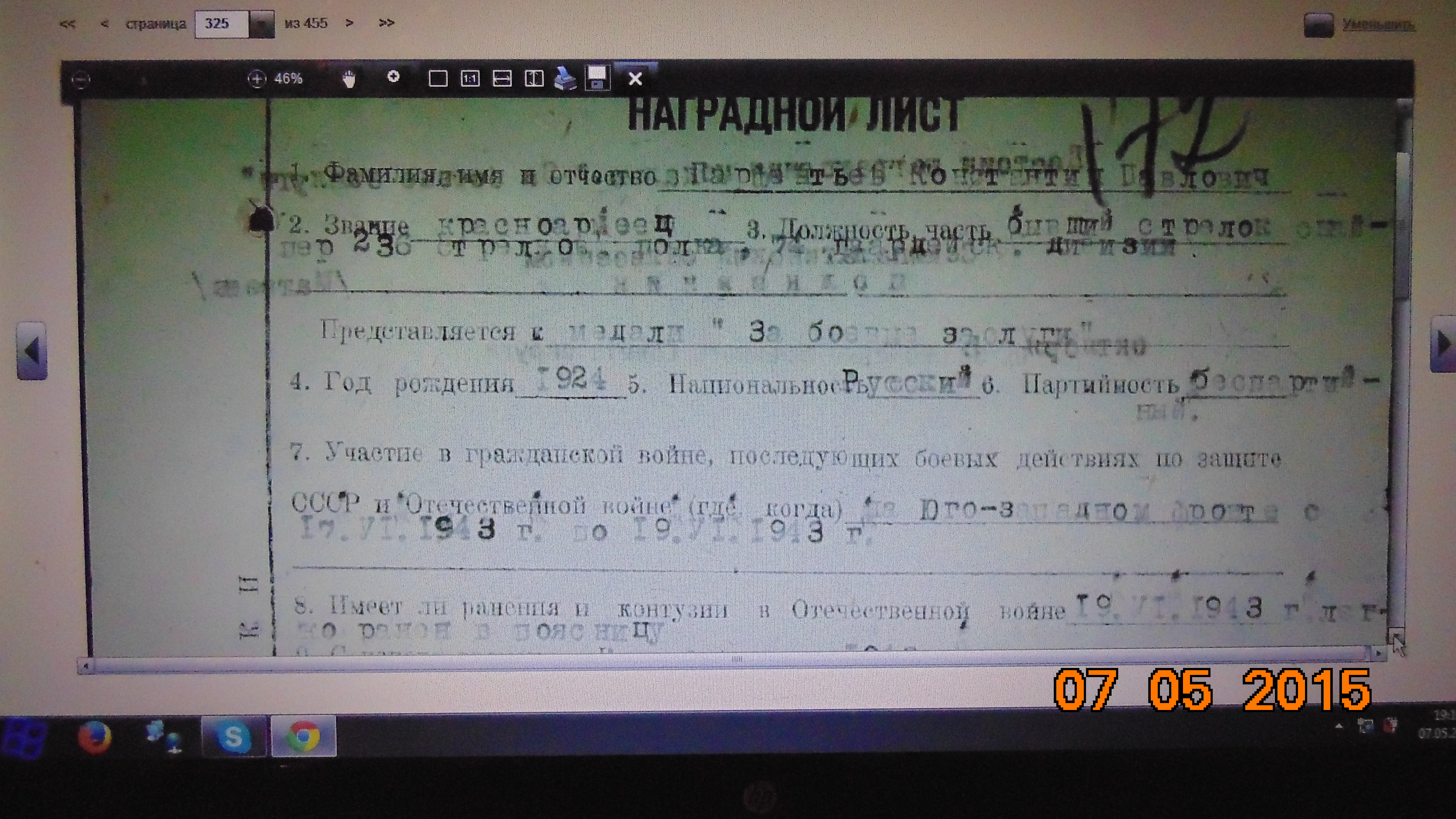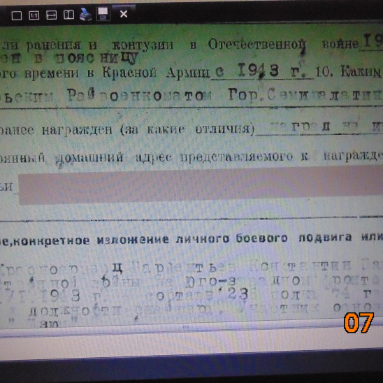 Был призван 8.02.43 г.и демобилизован 27.03.44 г. после второго ранения.Воевал в 229 стрелковом полку.