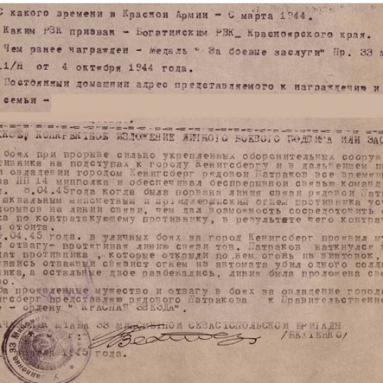 09.04.1945 года в уличных боях за город Кенигсберг проявил мужество и отвагу: протягивая линию связи, тов. Патраков наткнулся на 3-х солдат противника, которые открыли по нем огонь из винтовок. Не растерявшись, отважный связист огнем из автомата убил одного солдата противника, а остальные двое - разбежались. Линия была проложена своевременно.За проявленные мужество и отвагу в боях за овладение города Кенигсберг, представляю рядового Патракова к награде - ордену "КРАСНАЯ ЗВЕЗДА".