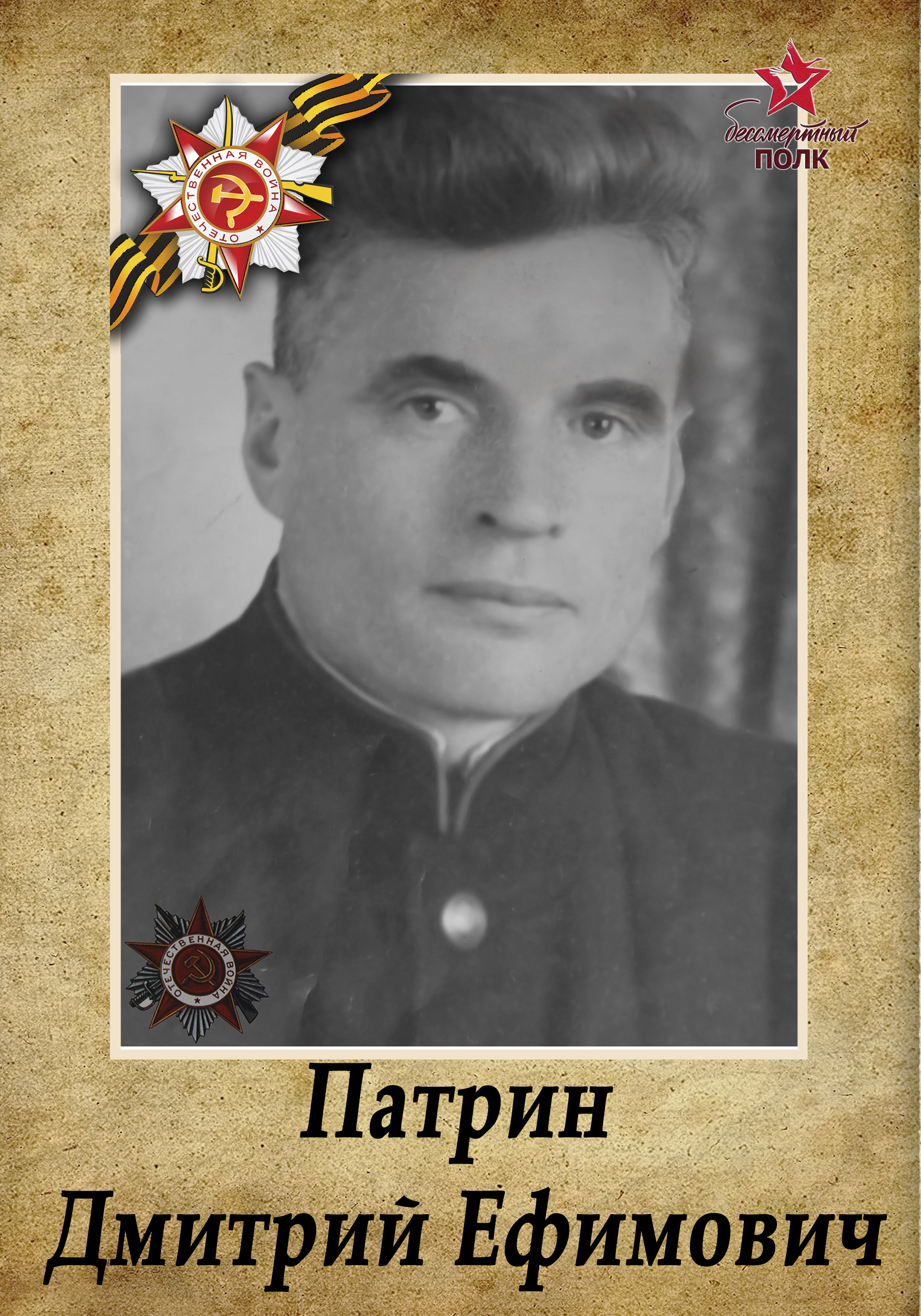 Боевой путь ветерана Патрин Дмитрий Ефимович прошёл всю войну от начала до конца. Служил в воздушно-десантных войсках. Участник боёв за освобождение столицы Австрии - города Вена, дважды был ранен. Кроме Ордена Отечественной войны имел ещё целый ряд медалей.