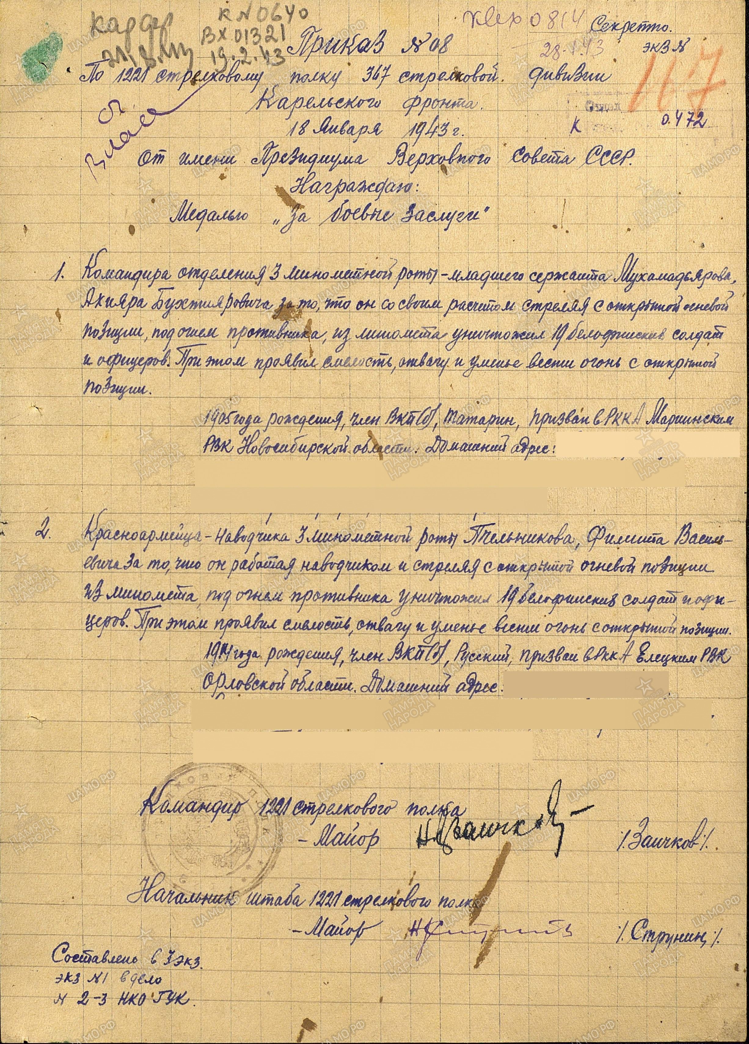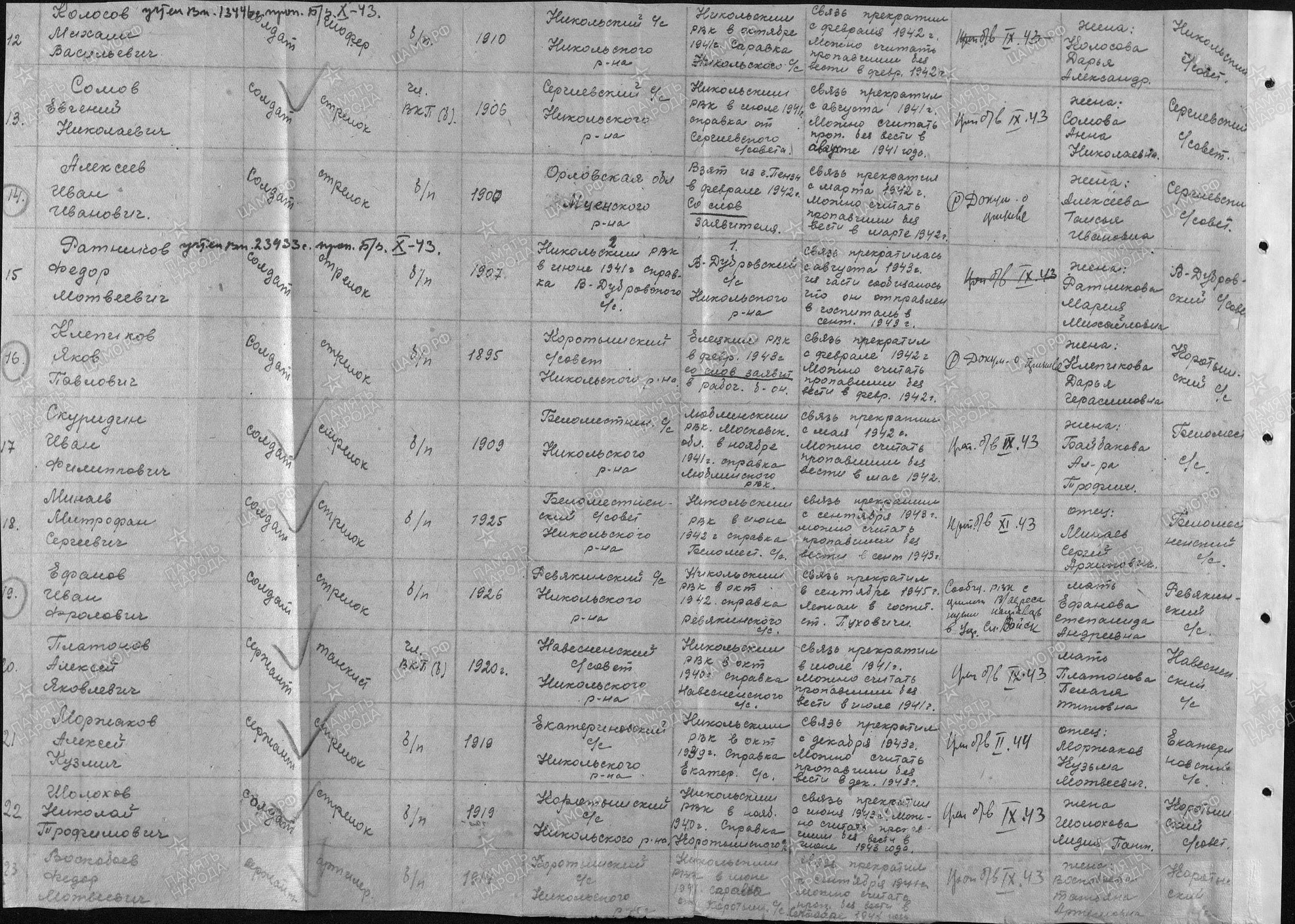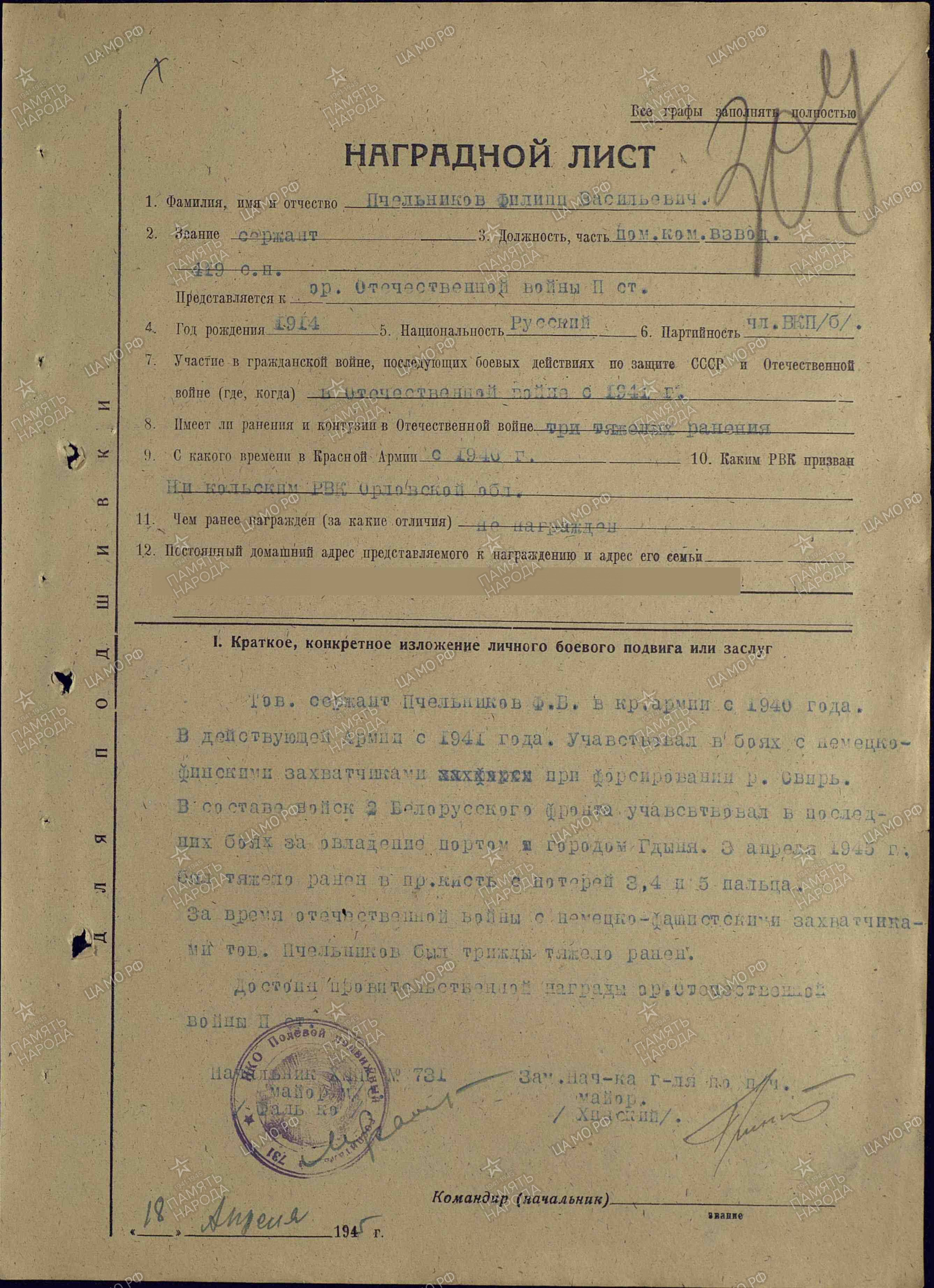 Филипп Васильевич призывался в 1940 году Никольским РВК, Орловская обл., Никольский р-н. Прошел всю войну, был ранен в 1941 и 1944 годах. Является обладателем многих военных наград, которые по праву заслужил своими героическими действиями в боях с фашистскими захватчиками. Был гениальным стрелком. После войны вернулся в родное село, был председателем колхоза.