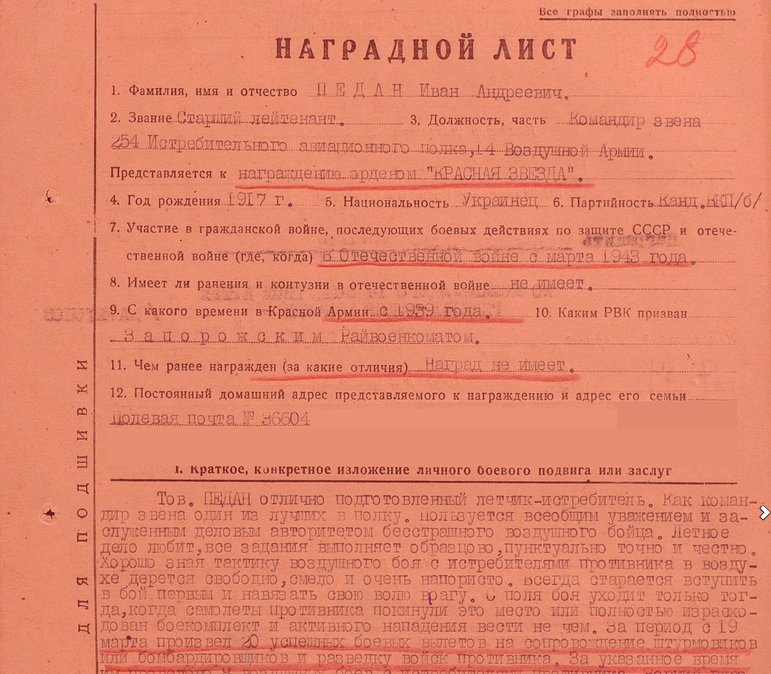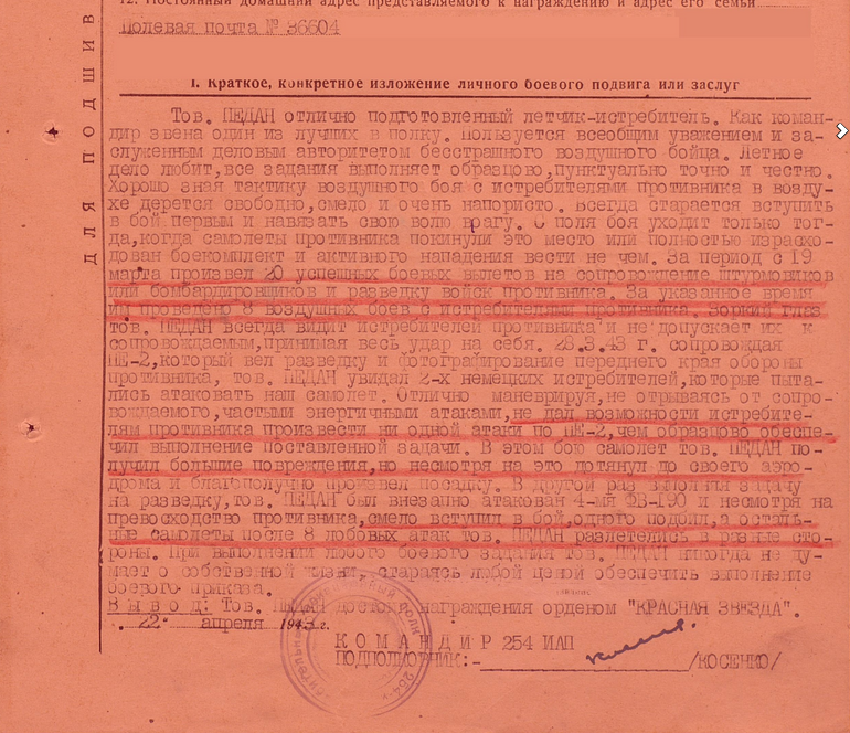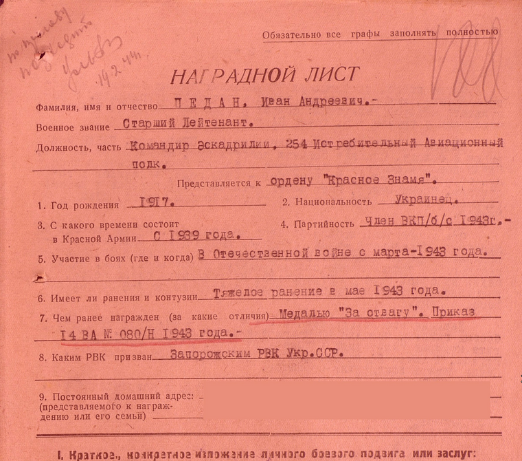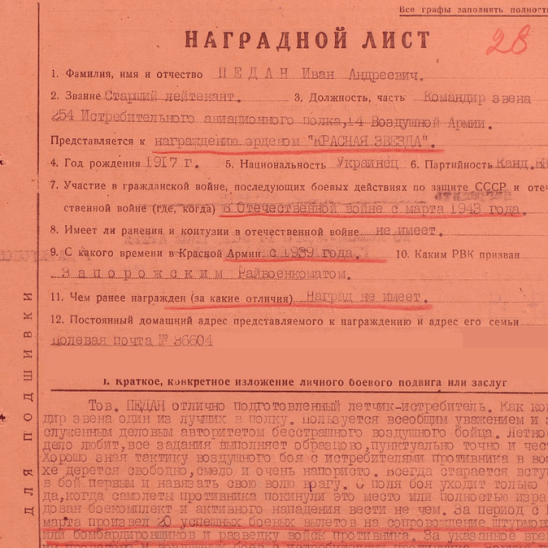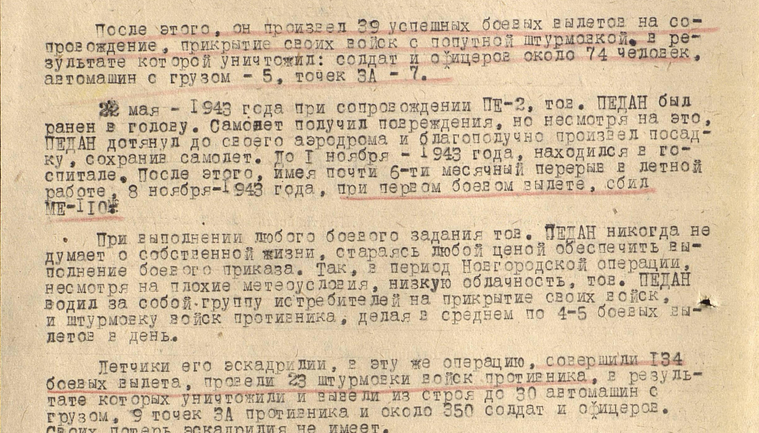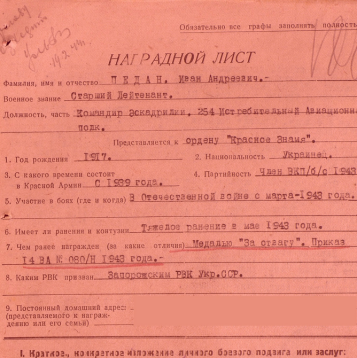 22 мая 1943-го года Иван Андреевич был ранен в голову. Самолет получил повреждения, но несмотря на это, Педан дотянул до своего аэродрома и благополучно произвел посадку, сохранив самолет. За этот подвиг Иван Андреевич Педан получил орден "Красного Знамени".