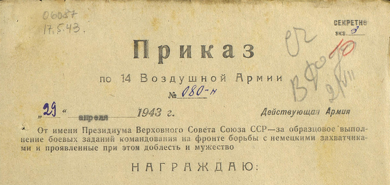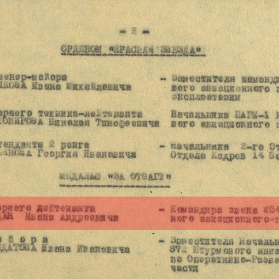 Иван Андреевич провел 20 воздушных боев с истребителями противника и лично сбил 3 самолета, за что и был награжден медалью "За Отвагу".