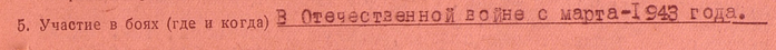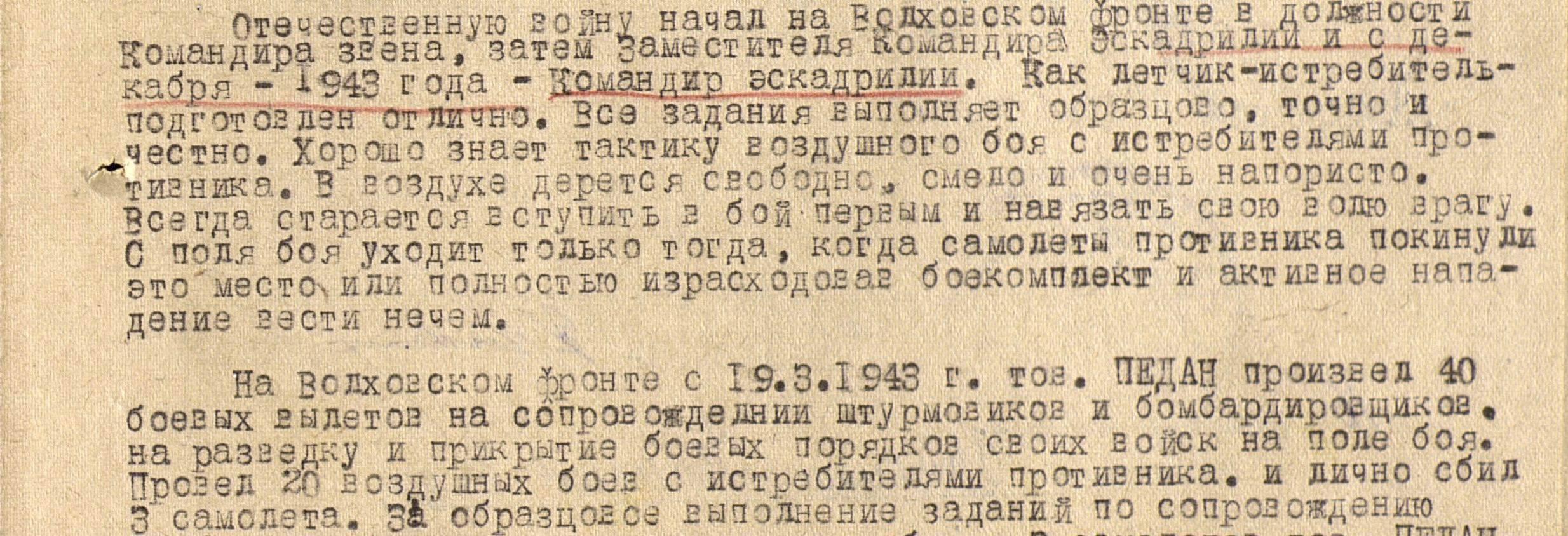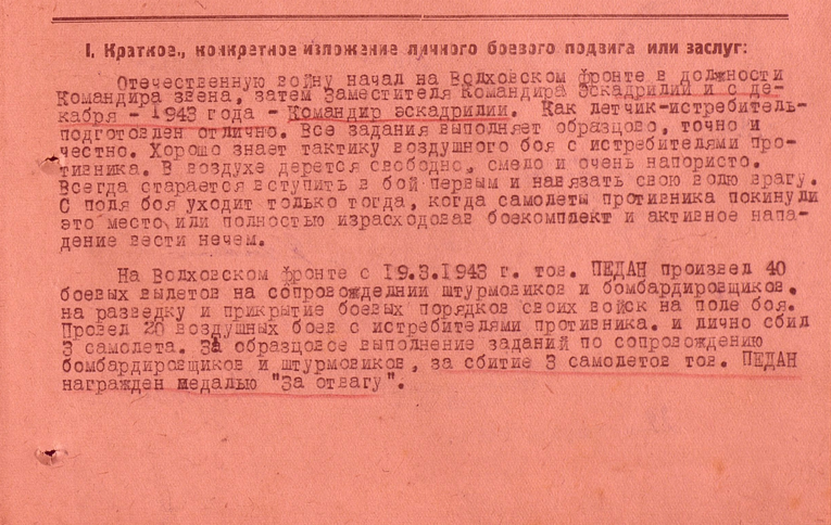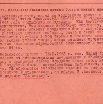 На Волховском фронте с 19 марта 1943-го года произвел 40 боевых вылетов на сопровождении штурмовиков и бомбардировщиков на разведку и прикрытие боевых порядков своих войск на поле боя.