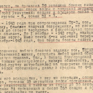 Летчики его эскадрилии в период Новгородской операции совершили 134 боевых вылета, провели 23 штурмовки войск противника, в результате которых уничтожили и вывели из строя до 30 автомашин с грузом, 9 точек артиллерии противника и около 350 солдат и офицеров.