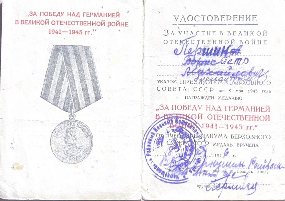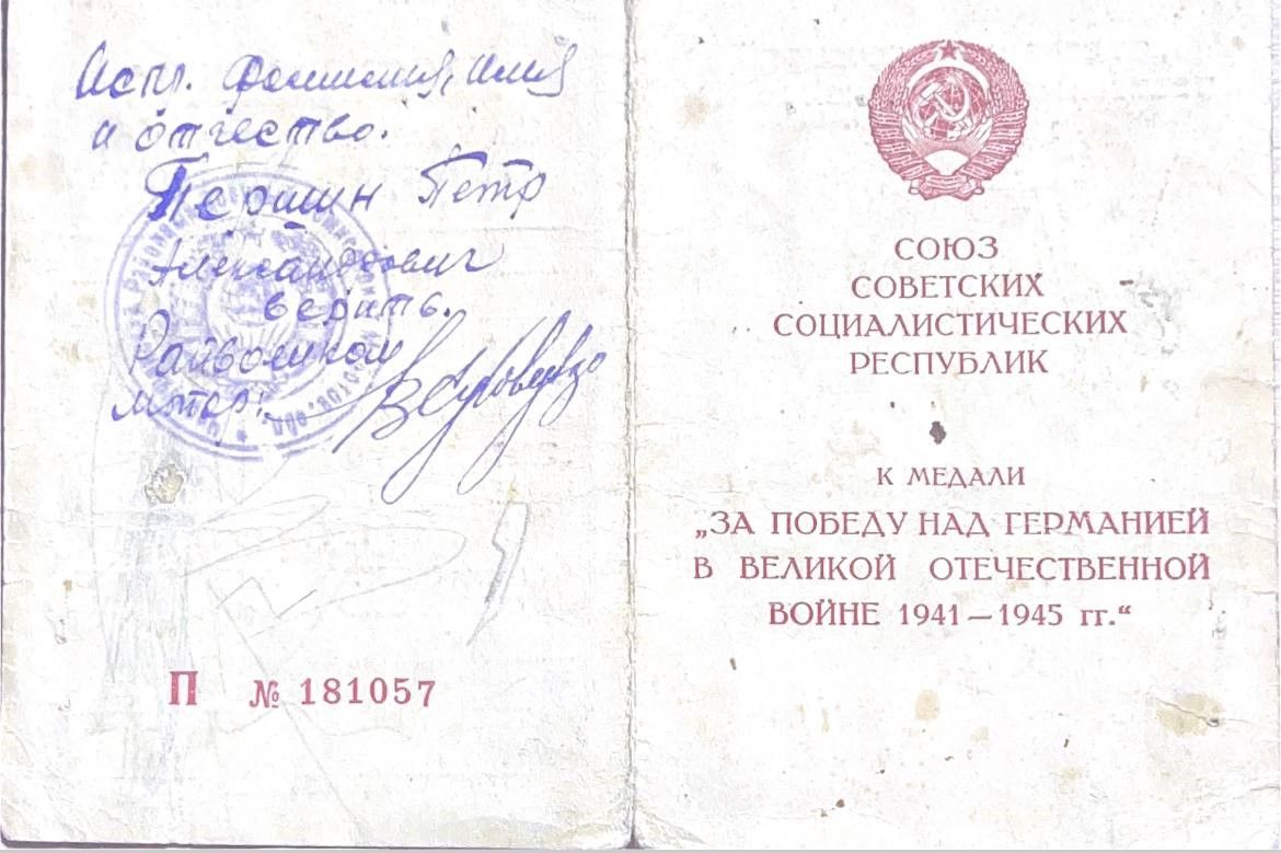 Першин Петр Александрович родился 23 сентября 1913 года в деревне Лысая Гора, Чернушинского района, Пермской губернии. В 1930 году закончил 7 классов Рябковской средней школы и поступил на курсы при Сарапульском педагогическим техникуме. С октября 1930 года по октябрь 1937 года – студент Пермского рабочего факультета, учитель седьмой Таушинской школы Чернушинского района. С октября 1937 по декабрь 1940 года – служба в РККА (участвовал в советско – финской войне). С октября 1941 по 28 августа 1945 года – учувствовал в ВОВ, демобилизовался в звании старшего лейтенанта по инвалидности. Во время войны воевал на передовой, два раза был в госпитале, первый раз был ранен в руку, второй раз в ногу. Ранение в ногу было очень тяжелым, из-за этого ее даже хотели ампутировать, но, советские врачи сумели ее спасти. Солдаты его подразделения вспоминали, что Петр Александрович всегда заботился о своих подчиненных, наставлял молодых бойцов, чтобы были осторожными, не лезли на рожон, давал житейские и военные советы. Когда было свободное время, то писал домой письма, писал всегда с оптимизмом, что все будет хорошо и мы обязательно победим! После войны работал на разных должностях, преподавал в школе. Про войну рассказывать не любил, говорил, что дело это очень нехорошее. Из-за полученных ранений прожил не долго, умер в октябре 1961 года в возрасте 48 лет. Награды сохранились не все, так как в доме была совершена кража и часть наград были украдены.