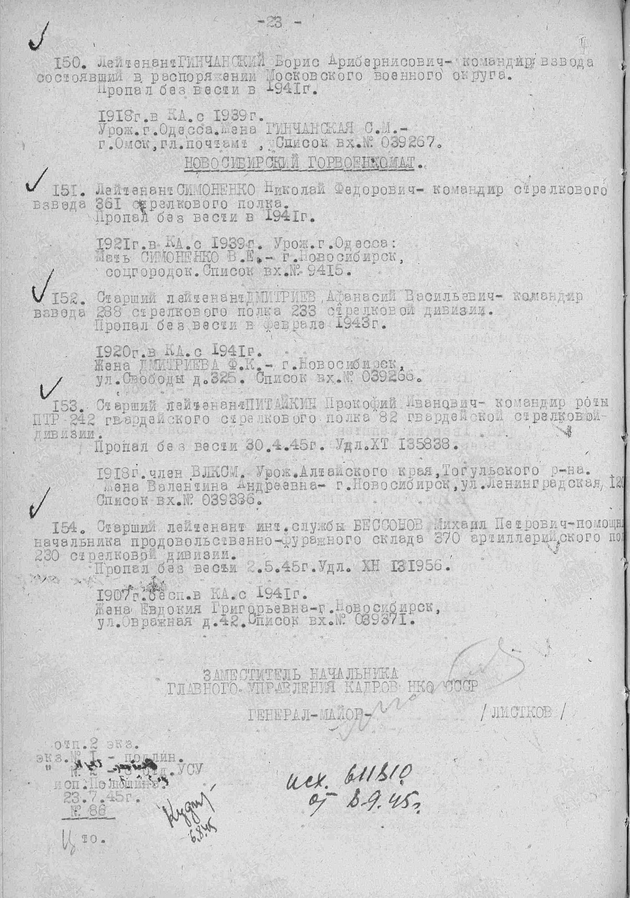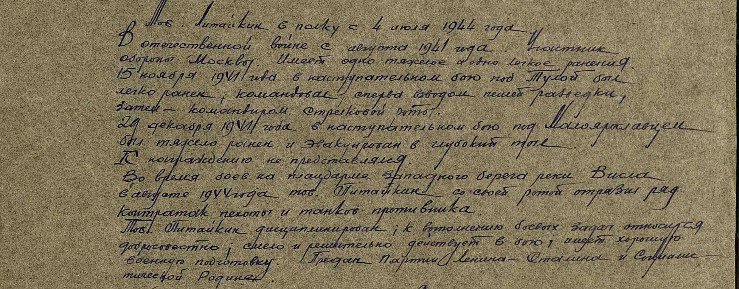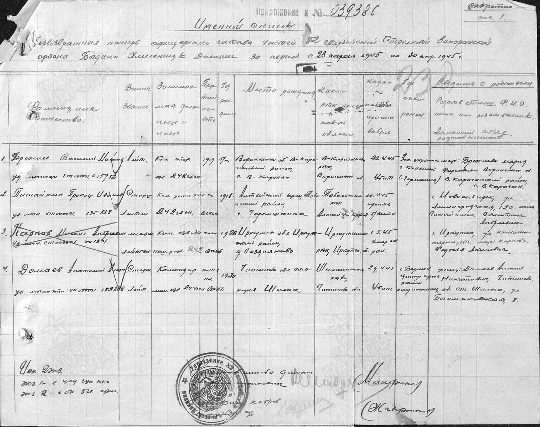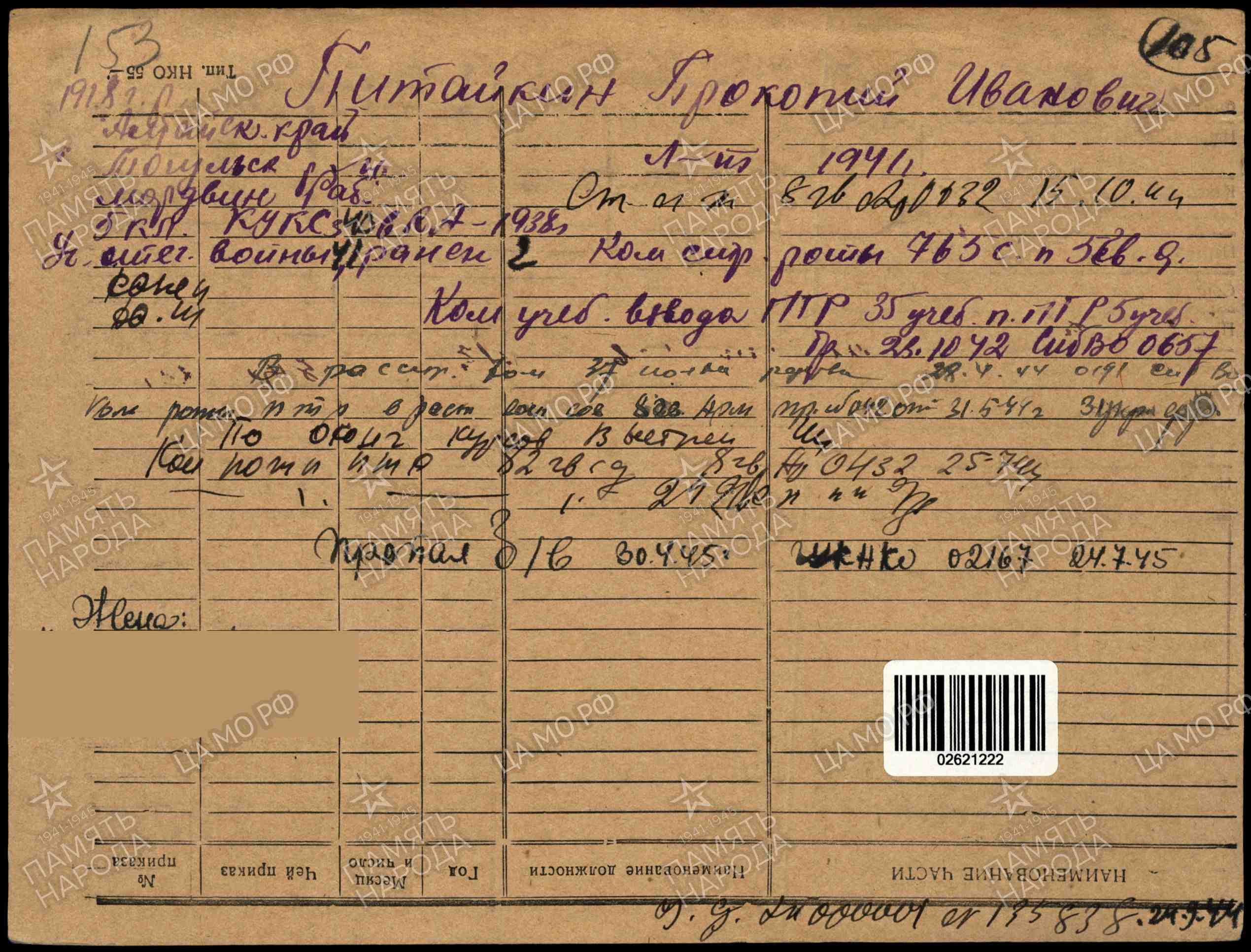 Родился в с. Черемшанка Алтайского края. Был призван на службу 1938 году. В июне 1941 года был призван на фронт. Участвовал в обороне Москвы, был дважды ранен. За боевые заслуги был награжден орденом «Красной звезды». Прошел всю ВОВ, дошел до Германии и 30.04.1945 пропал без вести в Германии. Воинская часть: 242 гв. сп 82 гв. сд 29 гв. ск 1 БелФ Даты подвига: 15.11.1941, 29.12.1941, 01.08.1944-31.08.1944 Наименование награды: Орден Красной Звезды Наименование воинской части: 242 гв. сп 82 гв. сд, 765 сп 5 гв. див.