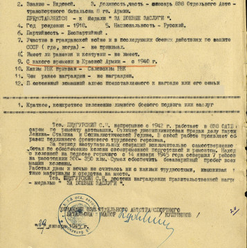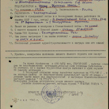 Родился в Каменец-Подольская обл., Сатановский р-н, с. Сатановка в 1918г. Участвовал в Великой Отечественной Войне слесарем по ремонту автомашин в составе 838 Отдельного Автотранспортного батальона 8 гв. Армии. Дошел до Берлина. За период наступательных операций исключительно самоотверженно работал по обеспечению колонн своевременной подготовкой и ремонтом. Сумел обеспечить безаварийный пробег всех машин колонны. Награждён двумя медалями «За боевые заслуги» (Приказы подразделения № 537/н от 18.03.1945г и № 819/н от 18.10.1945г), медалями «За освобождение Варшавы," "За взятие Берлина" и "За победу над Германией в Великой Отчечественной войне 1941-1945 гг."