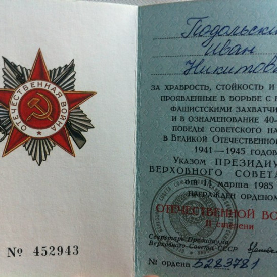 Подольских Иван Никитович родился в 1912 году. До войны работал в колхозе "Мичурин", после - в совхозе "Грибановский". В 1941 году был призван на фронт. Имел звание сержант. был отличным разведчиком. Участвовал в Курской битве, в битве на реке Эльба, дошел до Берлина.Имеет два ордена "Красной здезды", "За Берлин", "За боевые заслуги", медаль "Ветерана труда". Отличник сельского хозяйства. Вернулся с войны 23.06.1945 года. Умер 01.05.2001 года