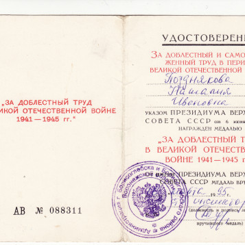 ополчении - копала окопы, дежурила по ночам на крышах домов. Награды: медаль «ЗА ДОБЛЕСТНЫЙ ТРУД В ВОВ1941-1945гг.»; юбилейная