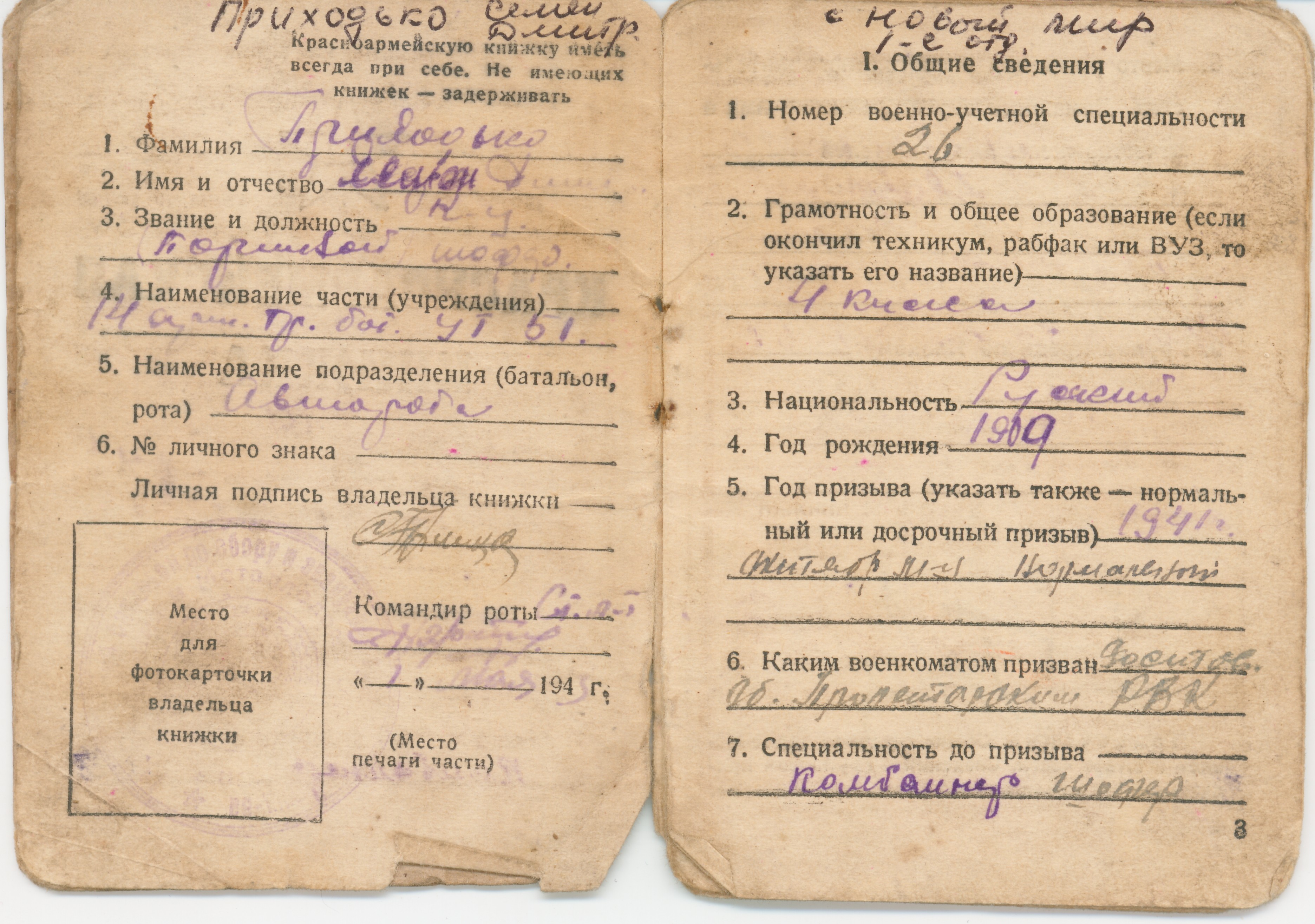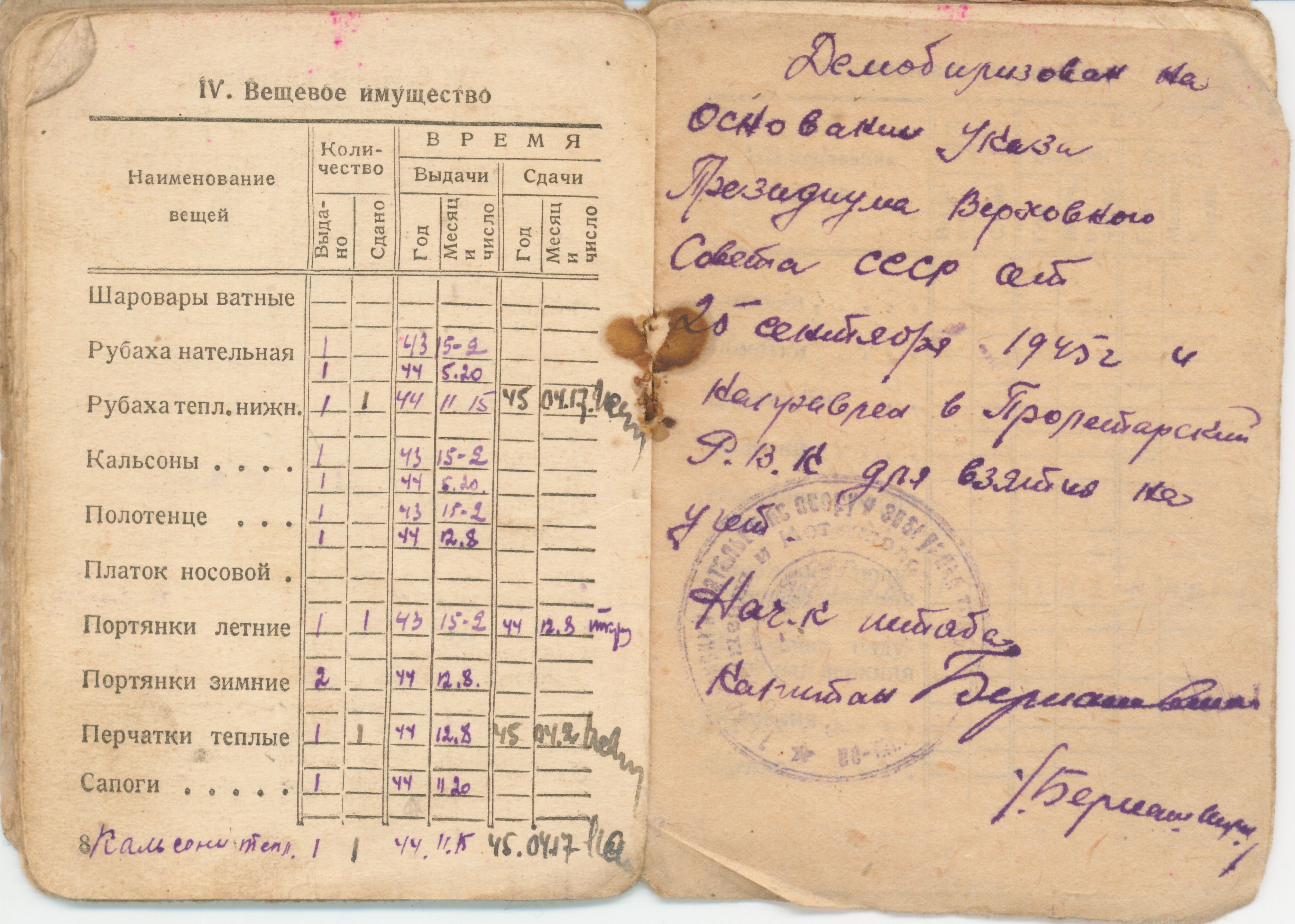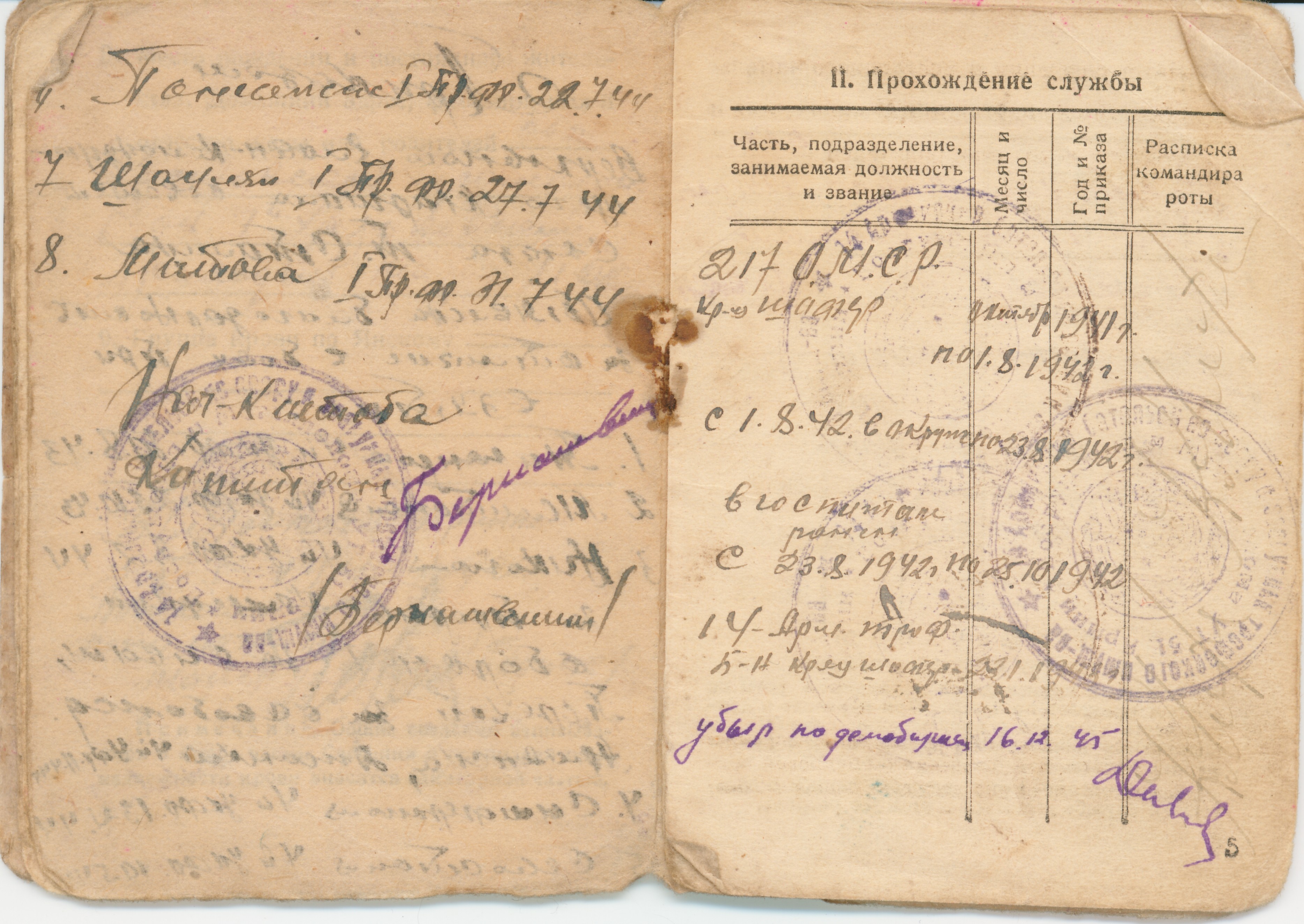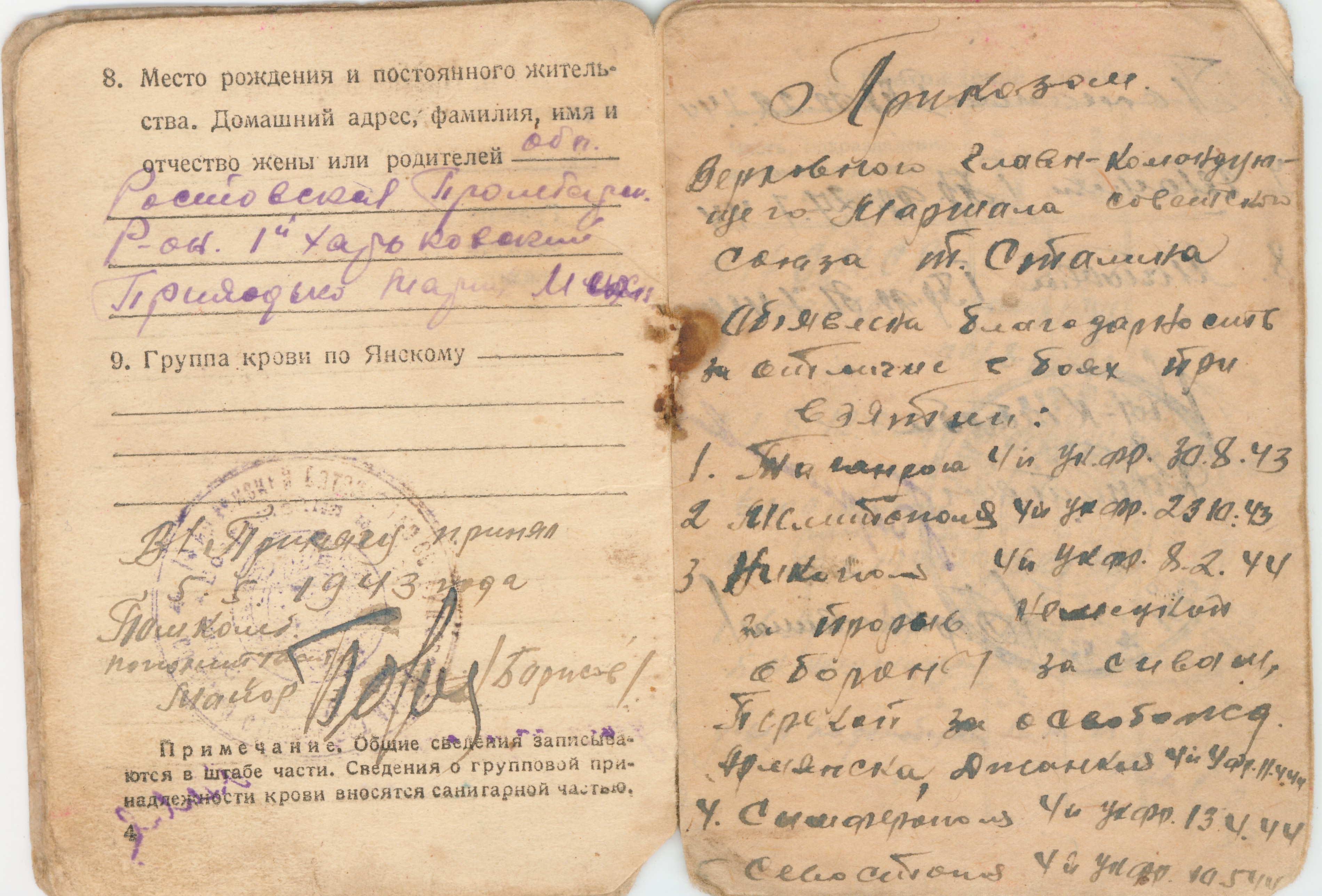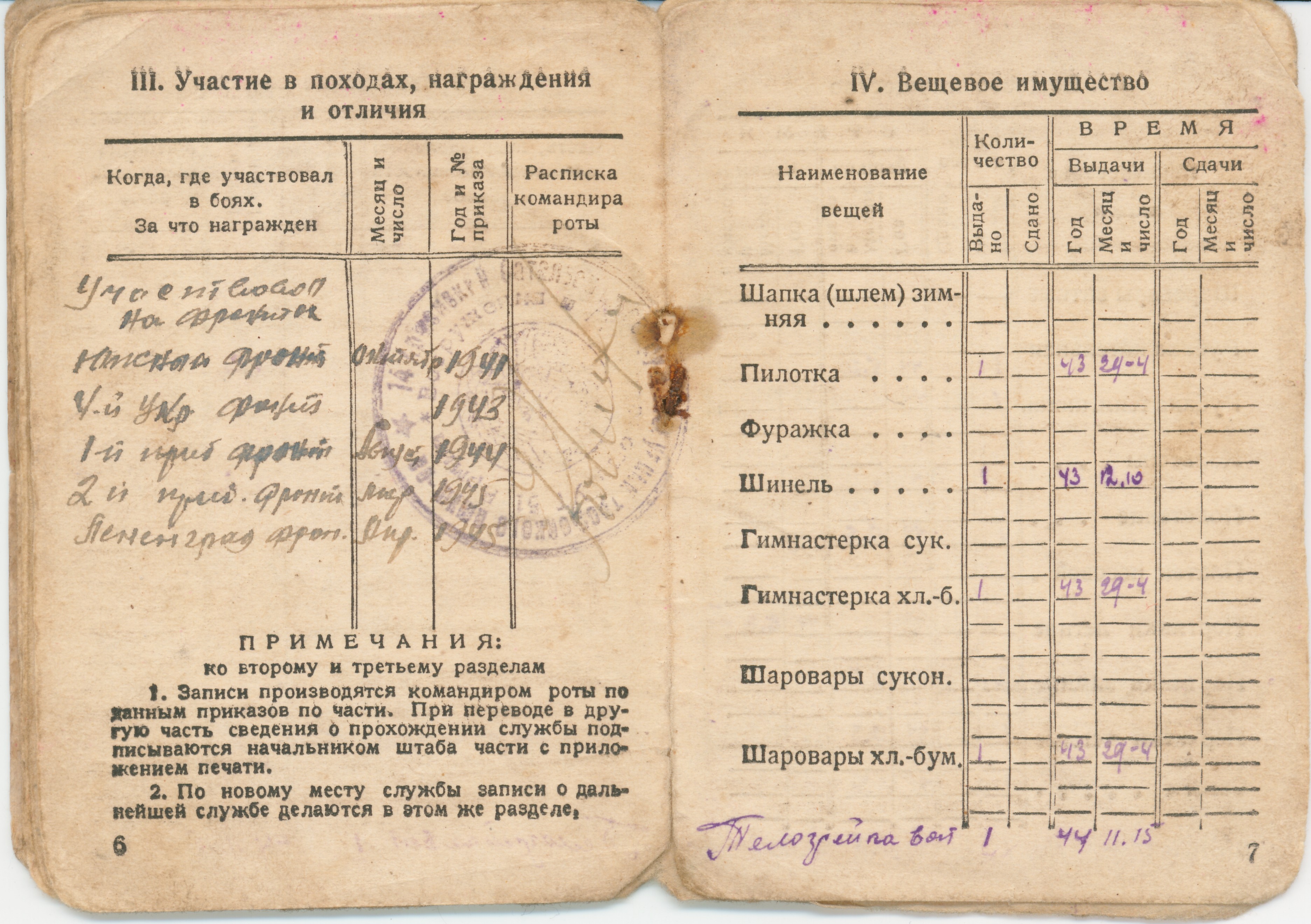 Призван в октябре 1941 годя Демобилизован в декабре 1945 Из красноармейской книжки… II Прохождение армейской службы октябрь 1941 год - 01.08.1942 год 217 ОМСР Южный фронт 01.08.1942-23.08.1942 окружение 23.08.1942-25.10.1942 в госпитале по ранению с 23.01.1943 - 14 арм. троф. батальон 18.12.1945 - убыл по демобилизации IV Участие в походах… Участвовал на фронтах Южный фронт - 1941 4-й Украинский фронт -1943 1-й Прибалтийский фронт -август 1944 2-й Прибалтийский фронт - март 1945 Ленинградский фронт -апрель 1945 Приказом Верховного главнокомандующего маршала Советского Союза т. Сталина объявлена благодарность за отличие в боях при взятии г. Таганрога - 4-й Ук. фр.- 30.08.43 г. Мелитополя - 4-й Ук. фр. - 23.10.43 г. Никополя - 4-й Ук. фр. - 8.2.44 за прорыв немецкой обороны за Сиваш, Перекоп, за освобождение Армянска, Джанкоя - 4-й Ук. фр. - 11.4.44 г. Симферополя - 4-й Ук. фр. -13.4.44 г. Севастополя - 4-й Ук. фр. - 10.5.44 г. Поневеж - 1-й Пр. фр. -22.7.44 г. Шауляй - 1-й Пр. фр. -27.7.44 г. Митава - 1-й Пр. фр. -31.7.44