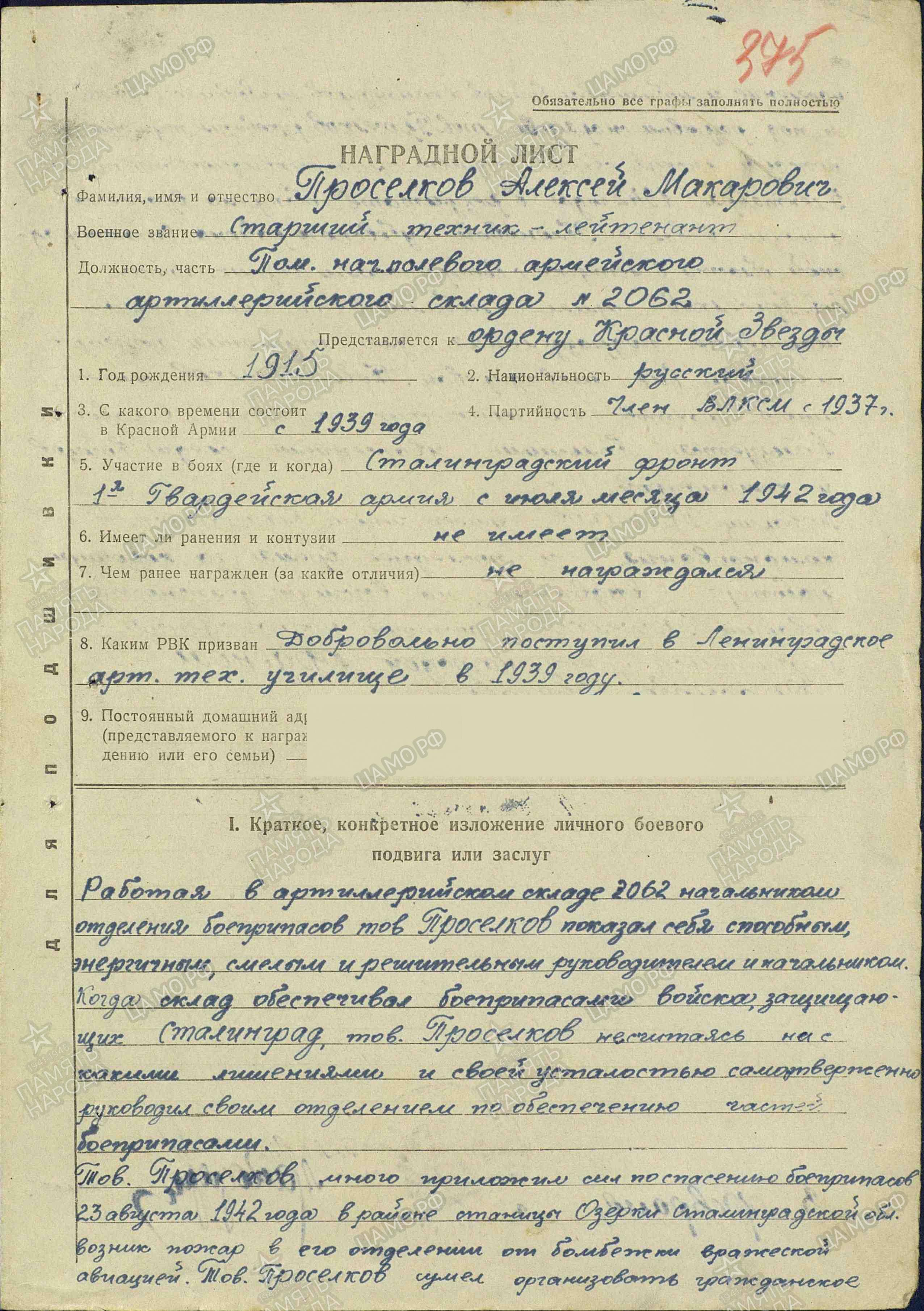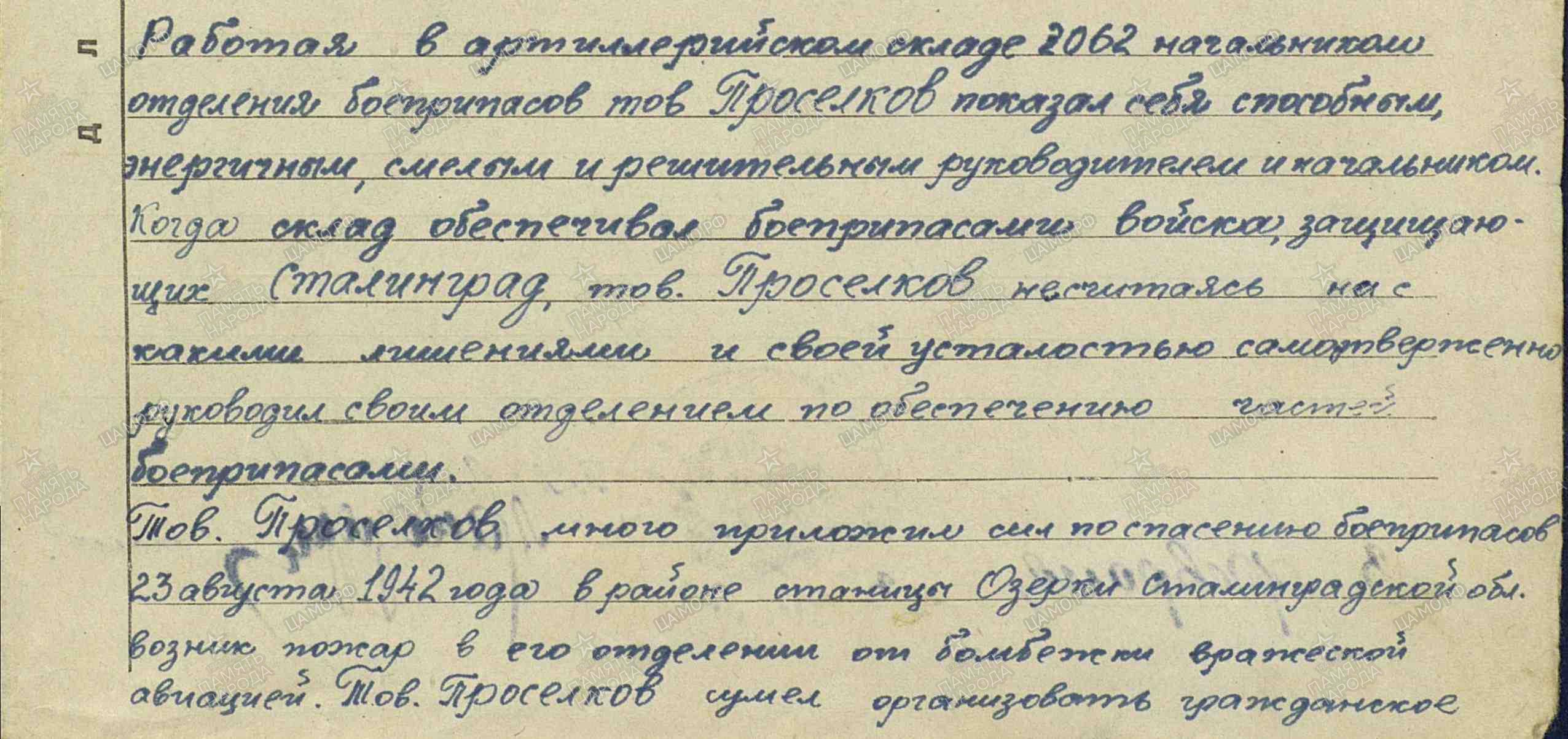 ПААС 2062 ЮЗФ, начальник армейского полевого артиллерийского склада 2062, член ВЛКСМ с 1937 г. Капитан техник, Участвовал в высадке Григорьевского десанта в селе Григорьевка Одесской области, а также участвовал в прорыве блокады Ленинграда. Имеет несколько ранений, одно из ранений в ногу. Проселков Алексей Макарович мой дедушка умер в 91 год, на фото его жена Проселкова (Мурзина) Нина Николаевна младший лейтенант на начало войны родилась 28 января 1921 - - бабушку контузило выбило зубы в 1943 году ее списали с войны на гражданку, умерла 18.09.1994 г. (родилась в г. Одоев Тульской обл. ). Фото с 09 мая 2018 года бессмертный полк в приложении (правнучка Доминика и Даниэла).