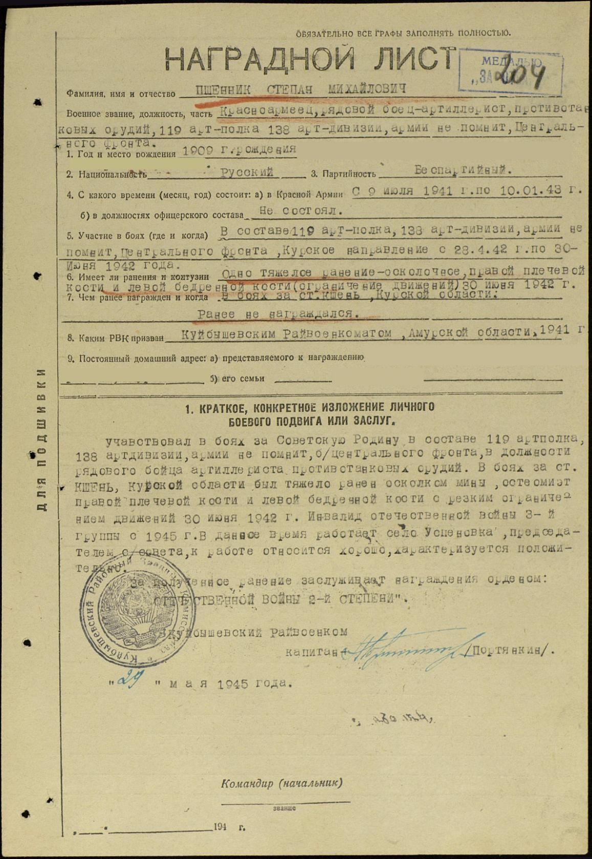 мой прадед ,рядовой артиллерист противотанковых орудий 119 арт-полка 138 арт-дивизии. в курской области 30 июня 1942 получил тяжелое осколочное ранение. инвалид отечественной войны 3-й группы