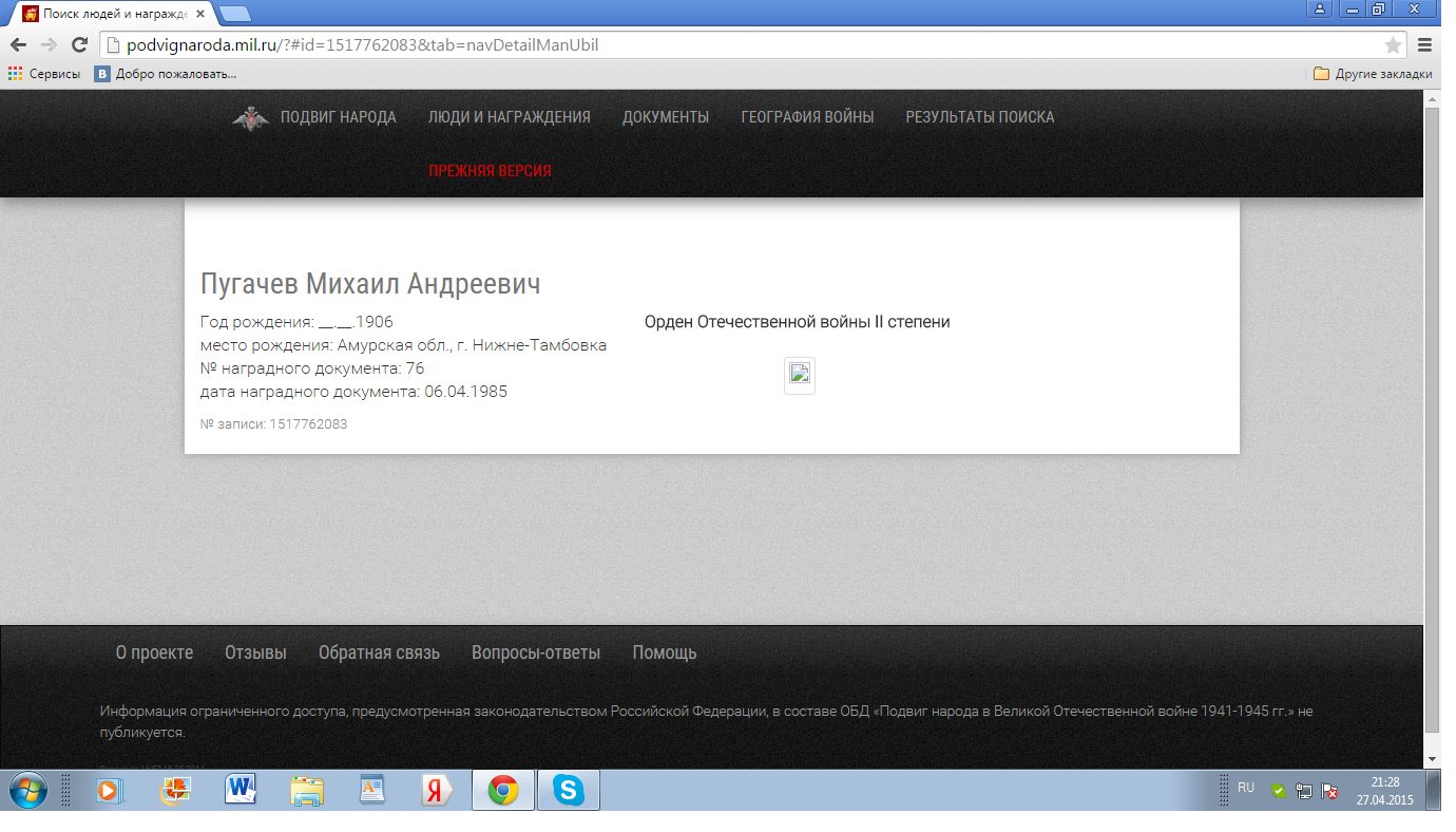 Мой дедушка по папиной линии. Пугачев Михаил Андреевич. Мне он запомнился , как очень добрый, чуткий и хороший человек. К сожалению и стыду своему , я не знаю историю его жизни. Он ушел из жизни, когда я пошла в 1 класс. Хотелось бы узнать больше, но к сожалению, не осталось тех людей, которые могли бы рассказать его историю. Знаю , что он очень сильно болел , но оставался мужественным человеком.