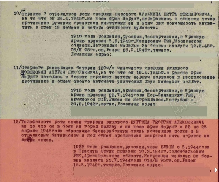 Призыв 03.10.1942, Соломбальским РВК, г. Архангельск. Гвардии рядовой, телефонист роты связи. 95 гвардейский стрелковый полк 31 гвардейской дивизии. Награжден: 21.03.1944 медаль "За боевые заслуги" 13.05.1945 медаль "За отвагу" в боях за город Пиллау и на косе Фриш Нерунг с 23 по 28 апреля 1945 года обеспечил бесперебойную связь командира полка с 3 стрелковым батальоном и под огнём противника исправил пять порывов на линии связи. 04.12.1945 медаль "За взятие Кенигсберга", под Кенингсбергом был тяжело ранен в ногу. 06.04.1985 орден Отечественной войны II степени. После войны женился на медсестре из госпиталя Екатерине, жили в г. Черняховск, Калининградской области.
