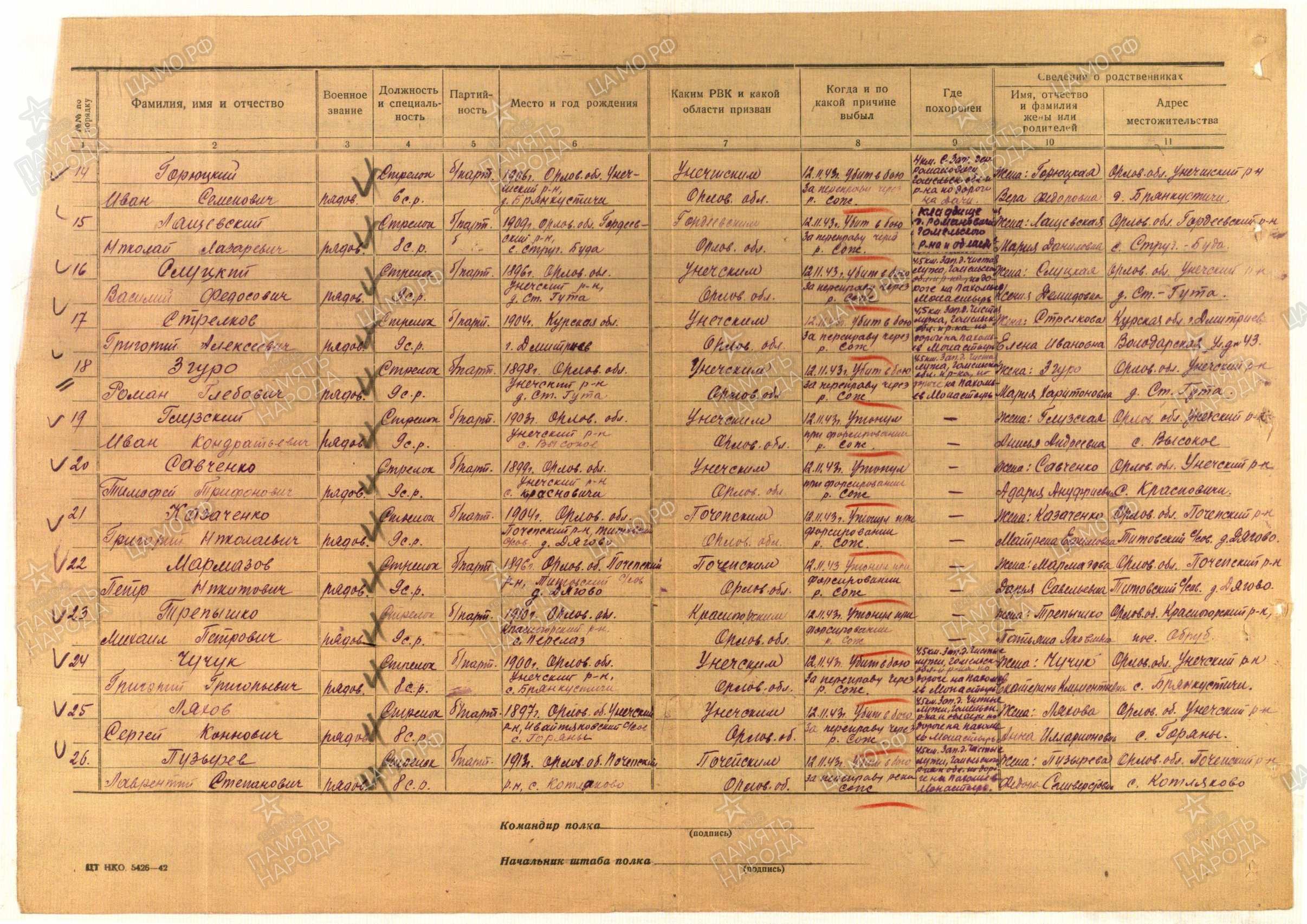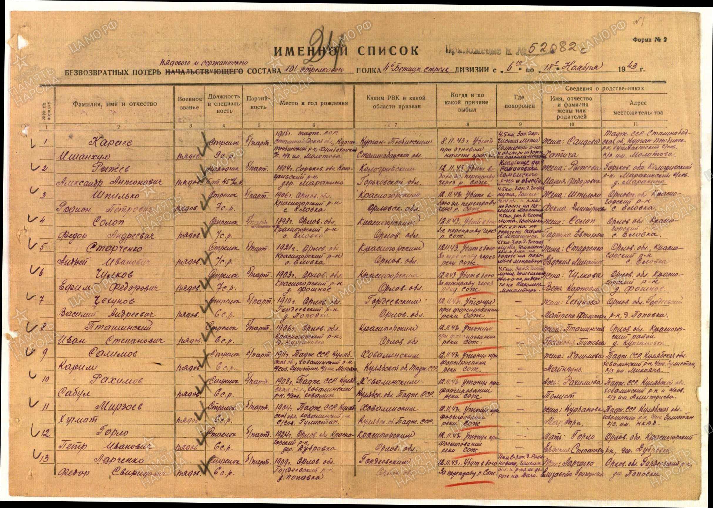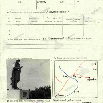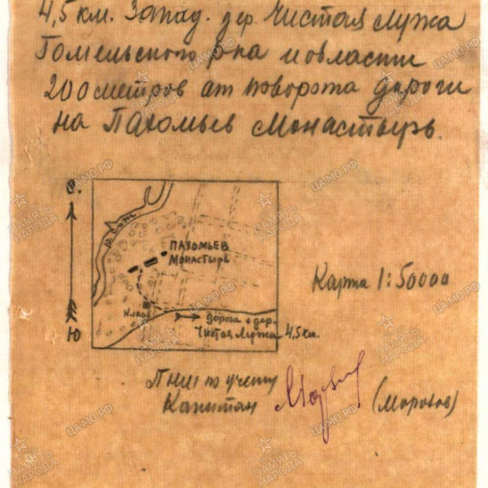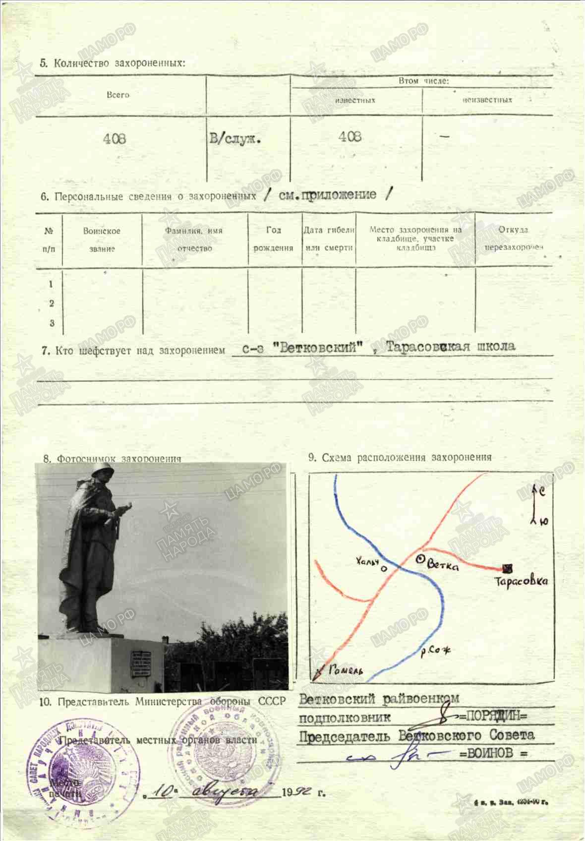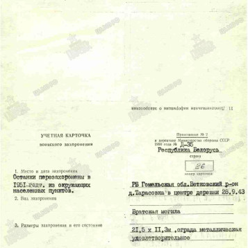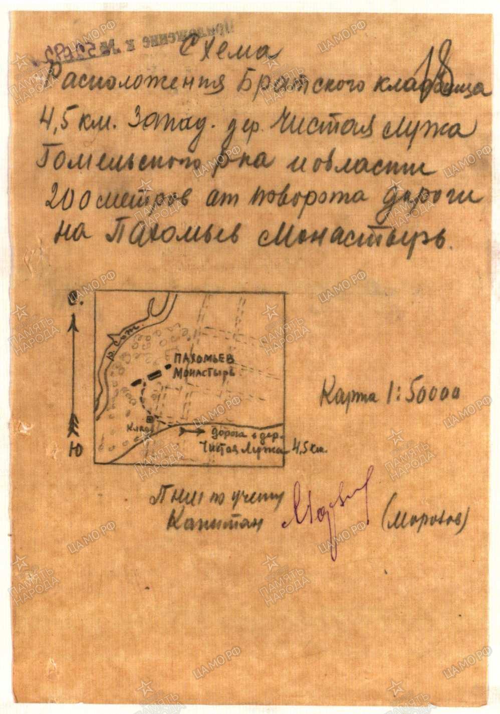 Согласно донесению, первичное место захоронения: Белорусская ССР, Гомельская обл., Гомельский р-н, д. Чистая Лужа, западнее, 4500 м, по дороге на Пахомьев монастырь.