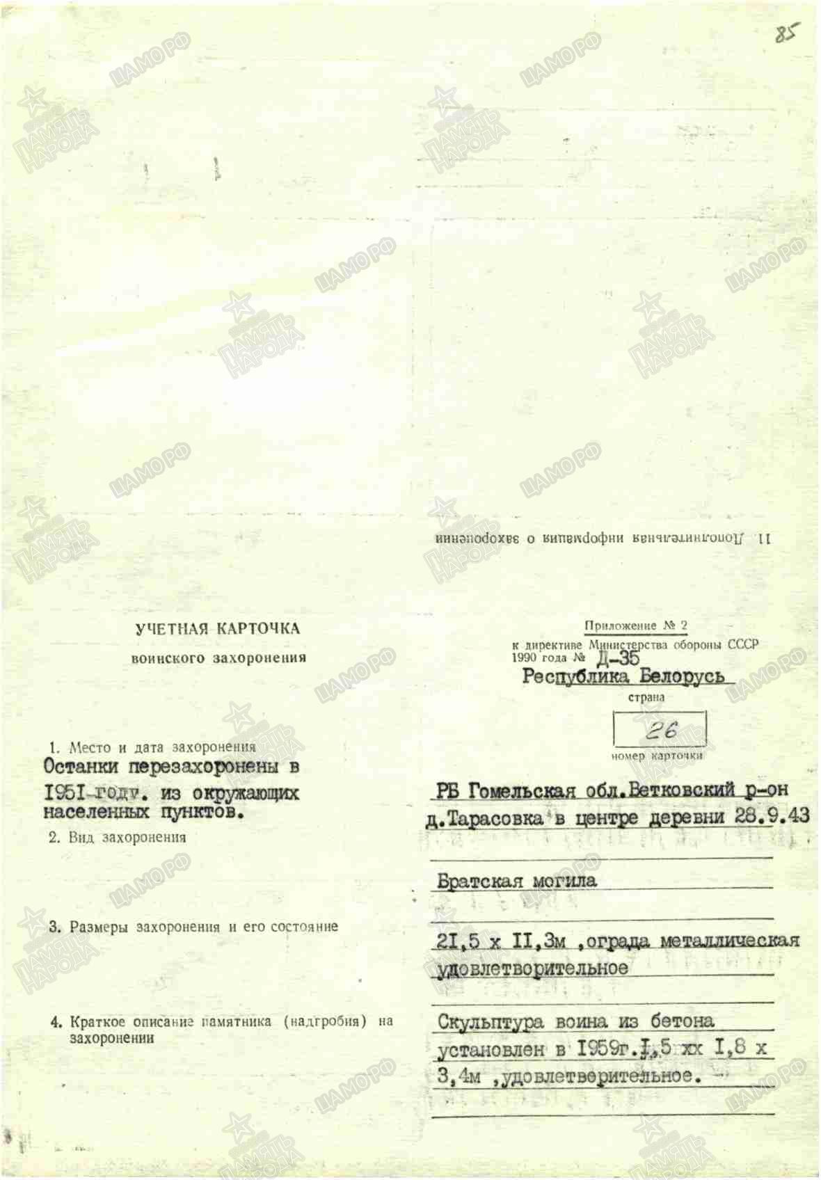 Позднее перезахоронен в братской могиле в центре деревни Тарасовка, Ветковский р-н.