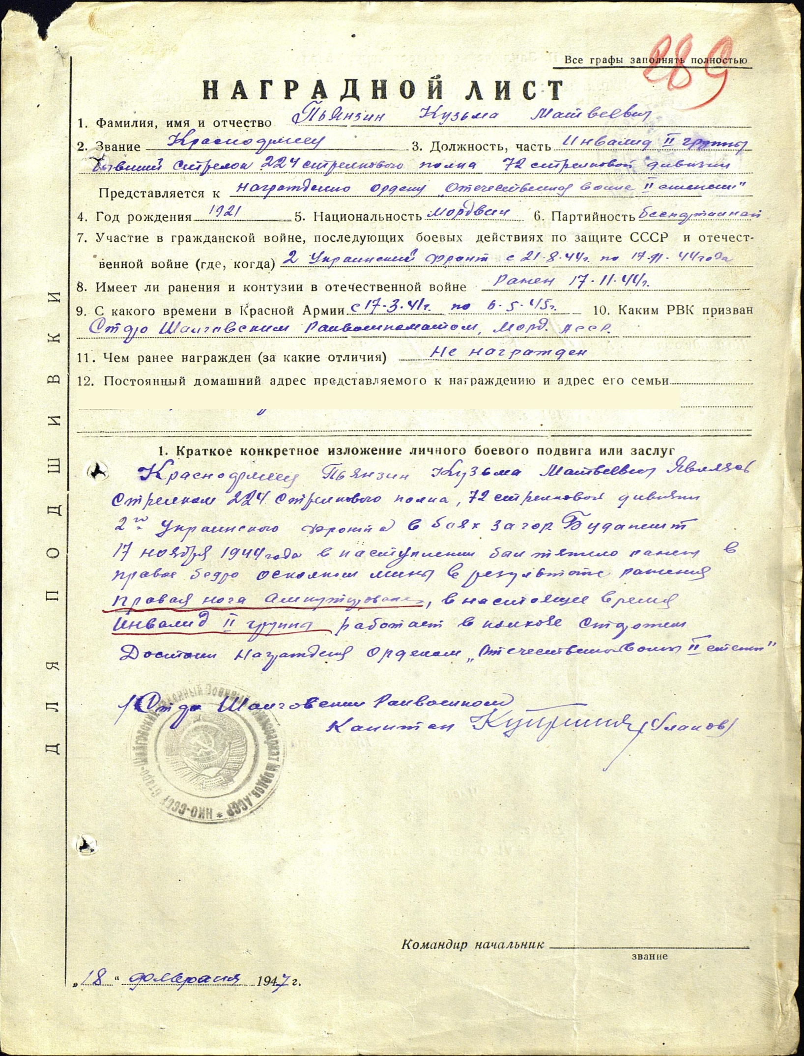 Место рождения: Республика Мордовия, Старошайговский район, село Сарга