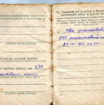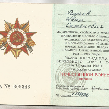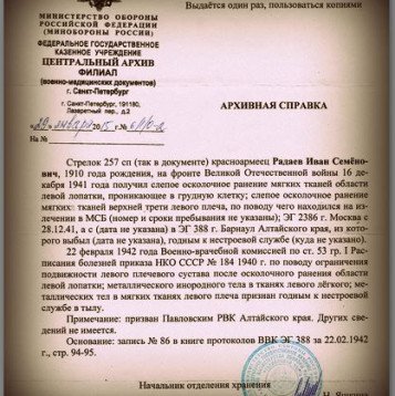 Наш дедушка Радаев Иван Семенович, рано остался без матери Агафьи Александровны. и в 12 лет уже подрабатывал, на частных подворьях, делал всякую работу по хозяйству, затем отучился на тракториста, и работал в МТС. вскоре пошел на срочную службу в РККА, потом женился и в 1935-м родился первенец, всего перед войной у них с нашей бабушкой родилося трое детей, в 1939-м ушел на Финскую войну в составе 56-й СД. 184 СП прошел все три месяца войны, вскоре грянула Великая Отечественная, 26 июня 1941 года, эшелоном в составе 107-й СД. 630 СП, дедушка попал под Москву. под деревню Митино Смоленской области,провоевав месяц 14 августа пулеметчик Радаев с ранением поступил в госпиталь ЭГ-2913, после лечения 5 октября направлен под Калинин в 185 СД 257 СП, там в жарких сражениях уже при контрнаступлении нашей армии получил второе тяжелое осколочное ранение 16 декабря 1941 года, под деревней Тургиново, Тверской области, 155 медсанбат. потом госпиталь в Москве в Тимирязевке. Затем на долечивание направлен в ЭГ-388 города Барнаула, в конце февраля 42-го признан нестроевым, и до декабря 1942 года служил в районе Ворошиловграда, точных сведений нет об этом периоде его военной судьбы, известно только что попадали они туда скрытно по Волге на баржах ночью сплавлялись в трюме с капустой, при обороне Сталинграда он не раз рисковал жизнью, доставляя обед в свое подразделение с полевой кухни, и попадал под авиацию противника, Там он получил третье свое ранение, контузию, и в декабре 1942 комиссован домой с фронта, далее труд в полеводстве, растил шестерых своих детишек, бригадир трактористов, награжден медалью За освоение целины", а также за боевые подвиги орденом Красной Звезды. орденом Отечественной войны 1-й степени, и другими наградами... Умер в 1994-м году. похоронен в родном селе. Помним, любим, гордимся!