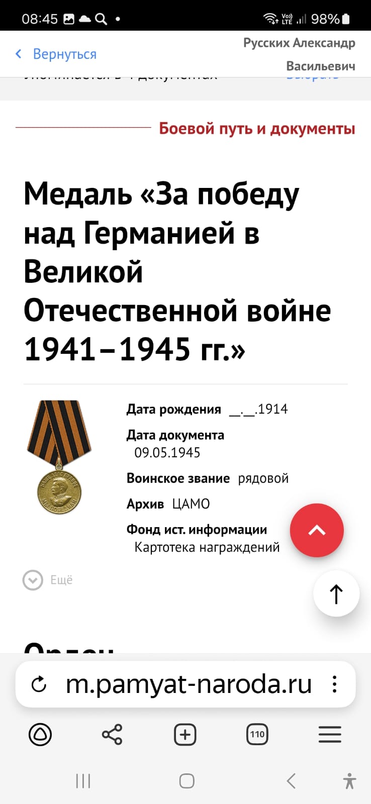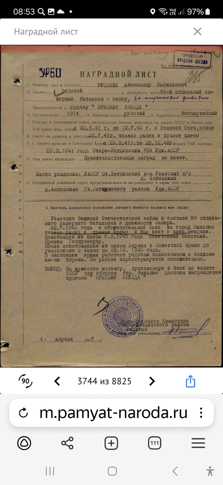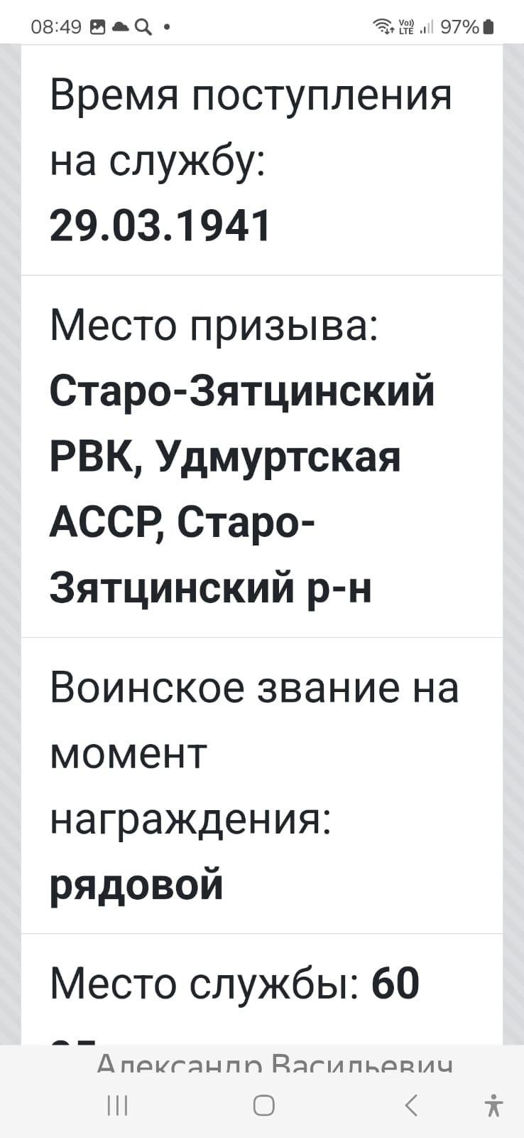 Участник Великой Отечественной войны в составе 84 отдельного саперного батальона в должности сапер. 22.07.1942 года в оборонительных боях за город Вильнос тяжело ранен в правое плечо и был взят в плен немцами. Освобожден из плена 06.03.1945 г. советскими войсками. Прошел госпроверку. После освобождения из плена служил в Советской Армии до увольнения в запас 28.12.1945 года. Время поступления на службу 29.03.1941. Место призыва: Старо-Зятцинский РВК, Удмуртская АССР, Старо-Зятцинский р-н. Награды: За мужество и отвагу, проявленную в боях по защите СССР про обороне гор. Вильнос награжден орденом " КРАСНАЯ ЗВЕЗДА", медаль "За победу над Германией в Великой Отечественной войне 1941-1945 гг."