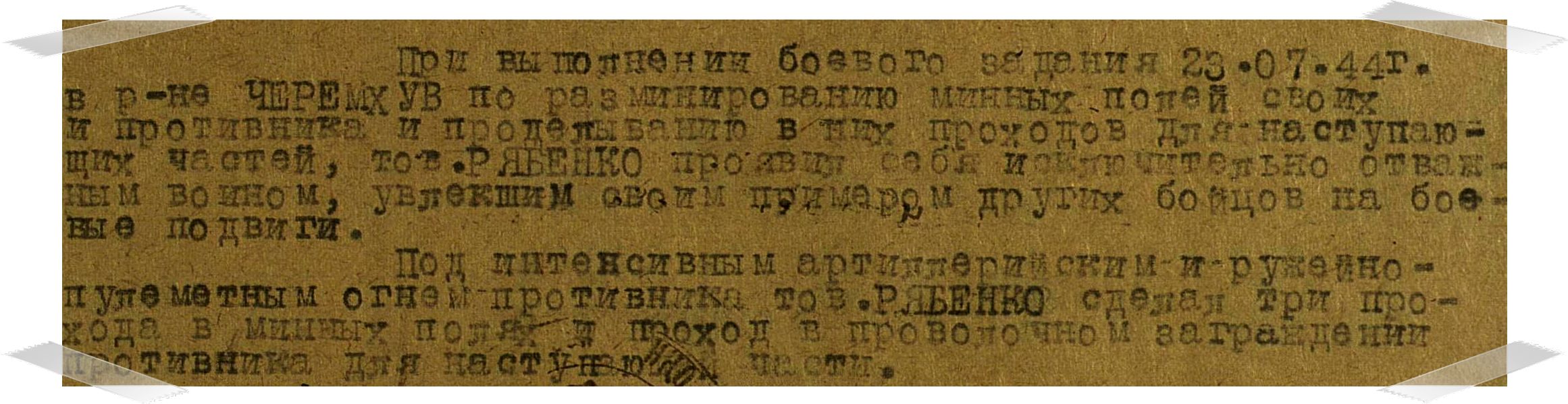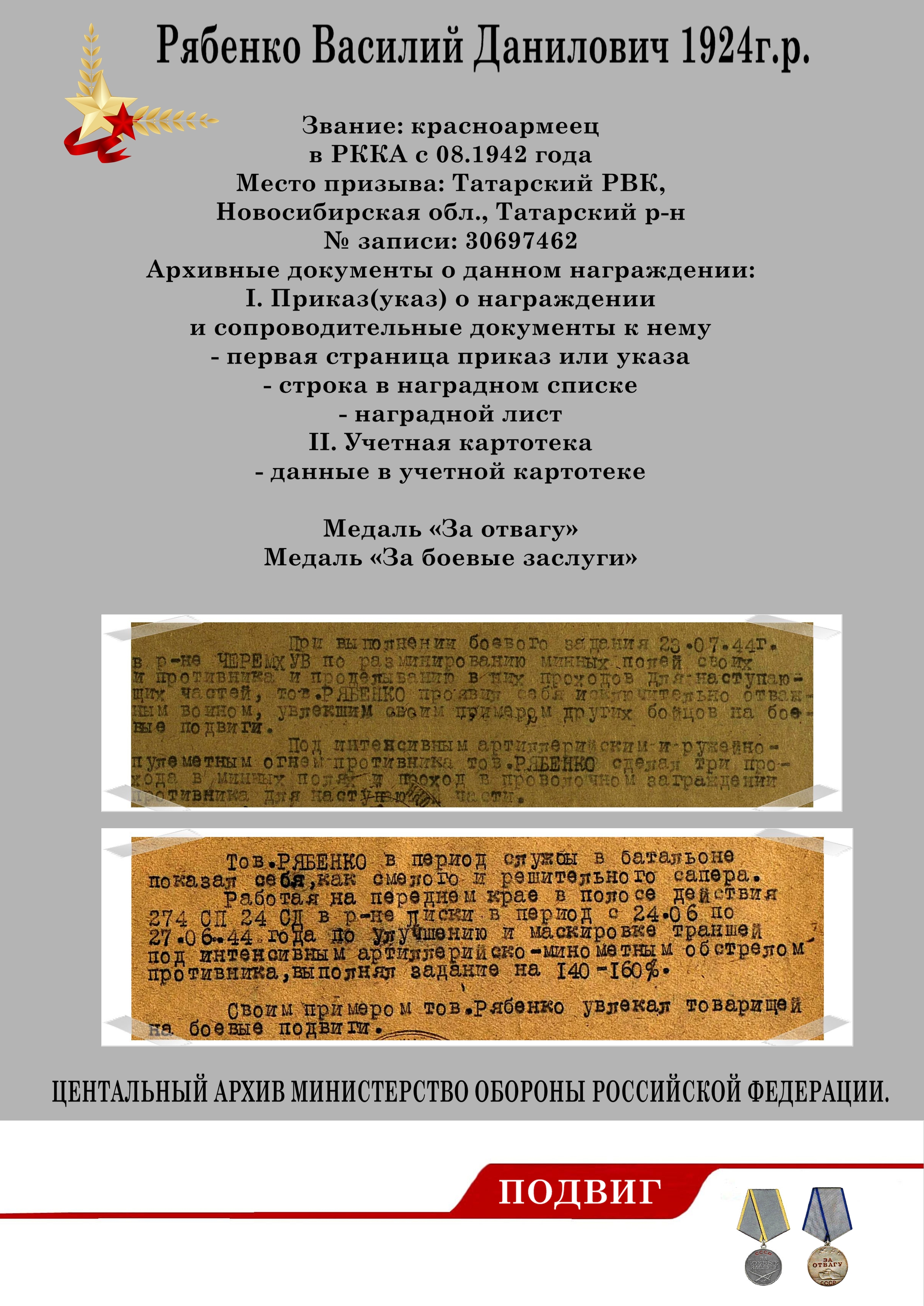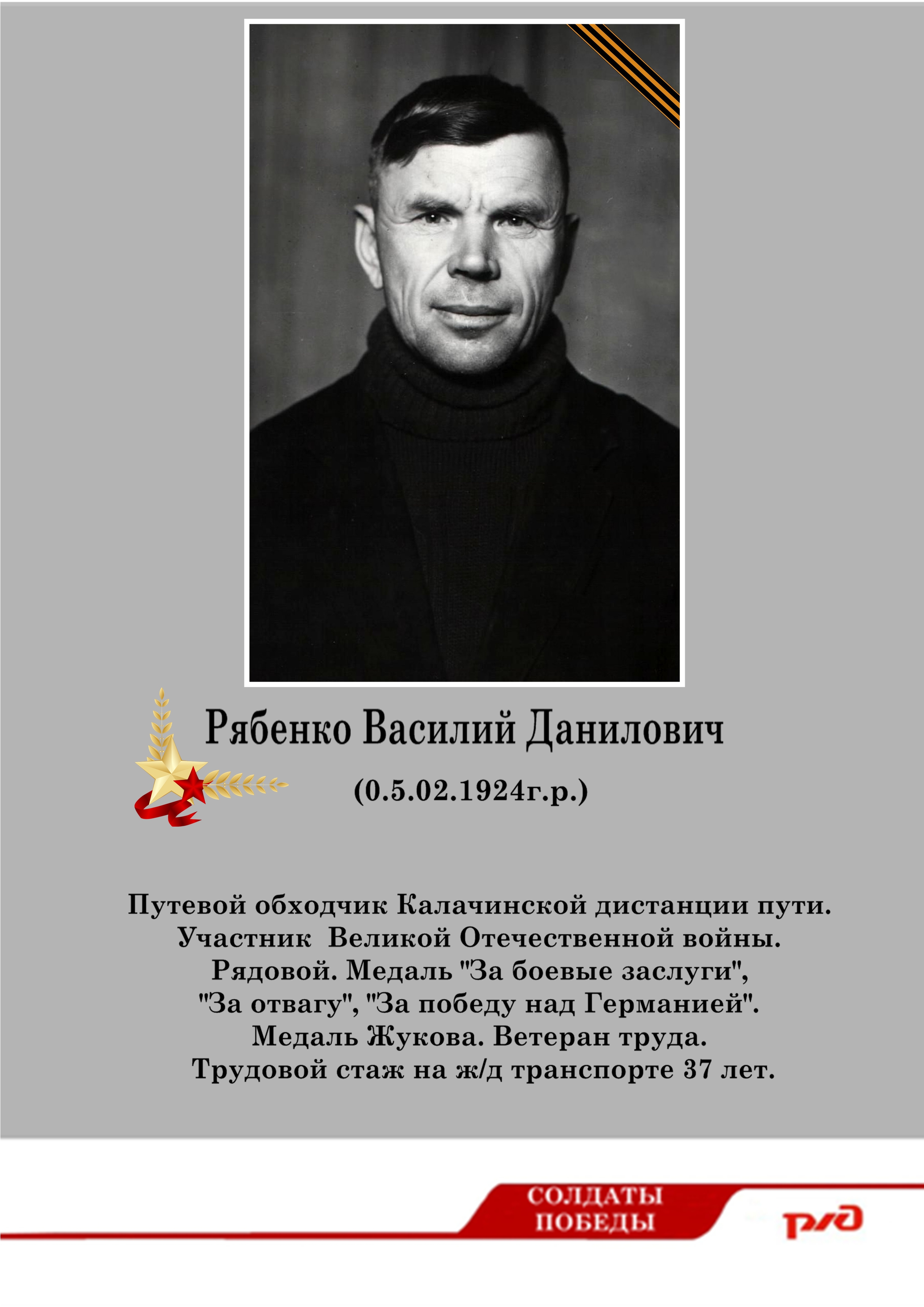 РЯБЕНКО ВАСИЛИЙ ДАНИЛОВИЧ-(1924г.р.) Участник Великой Отечественной войны. Сапер, 9 инженерно-саперной Проскуровской бригады. 133 инженерно-саперного