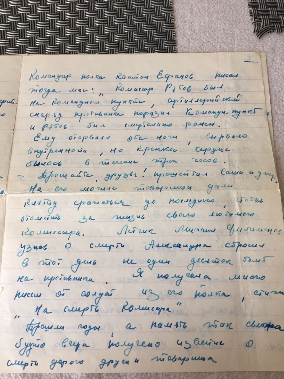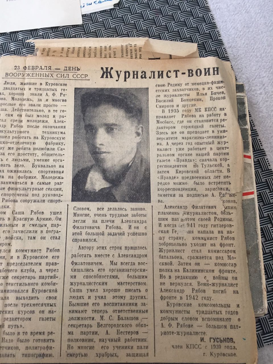 Мой дедушка - Александр Филатович Рябов погиб в бою 3 июля 1942 года в бою под деревней Александровка Калининской области. Перезахоронен в деревне Гусево, Оленинского района Калининской области (ныне Тверская) - 10 декабря 1994 года в центре деревни Гусево.