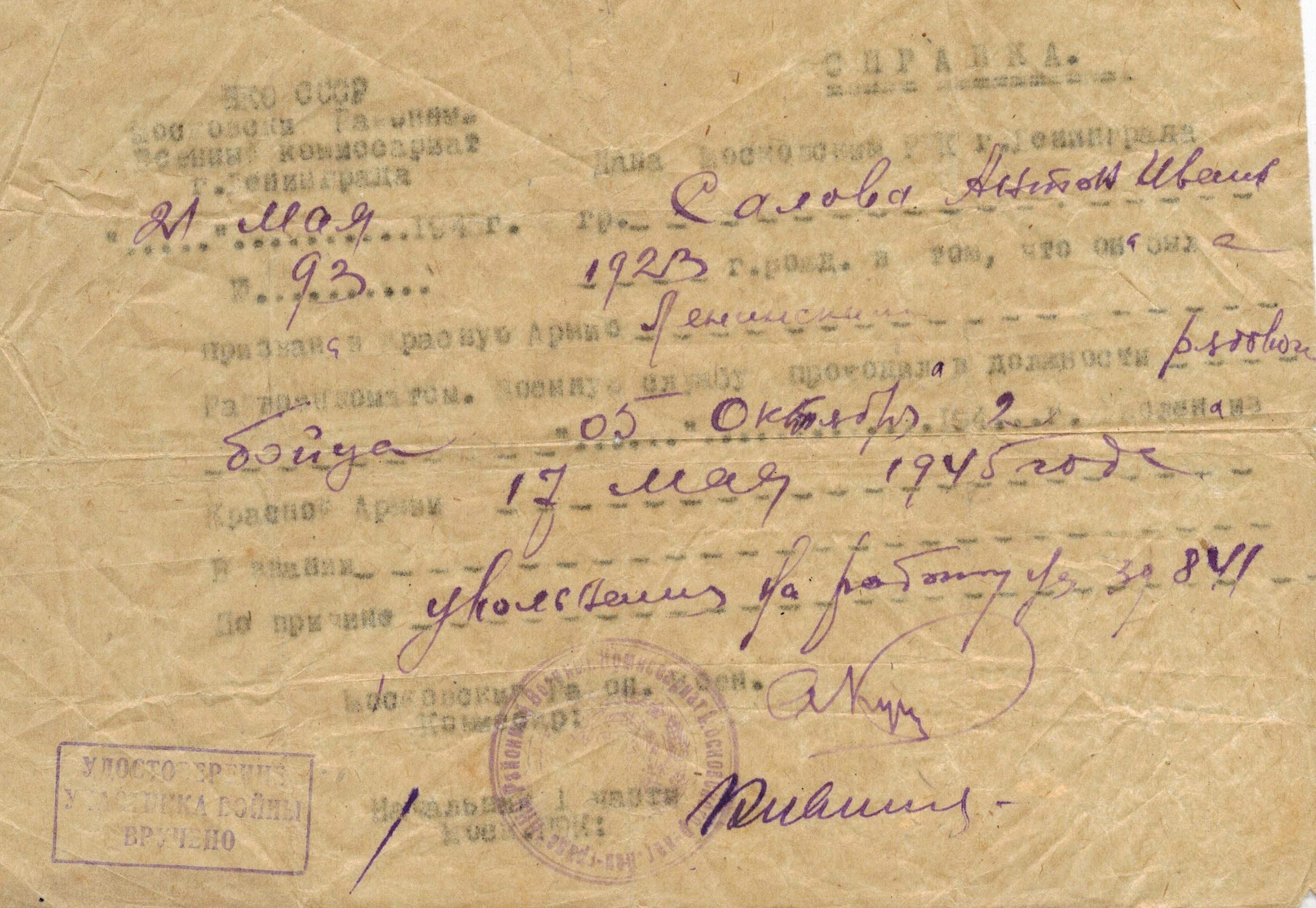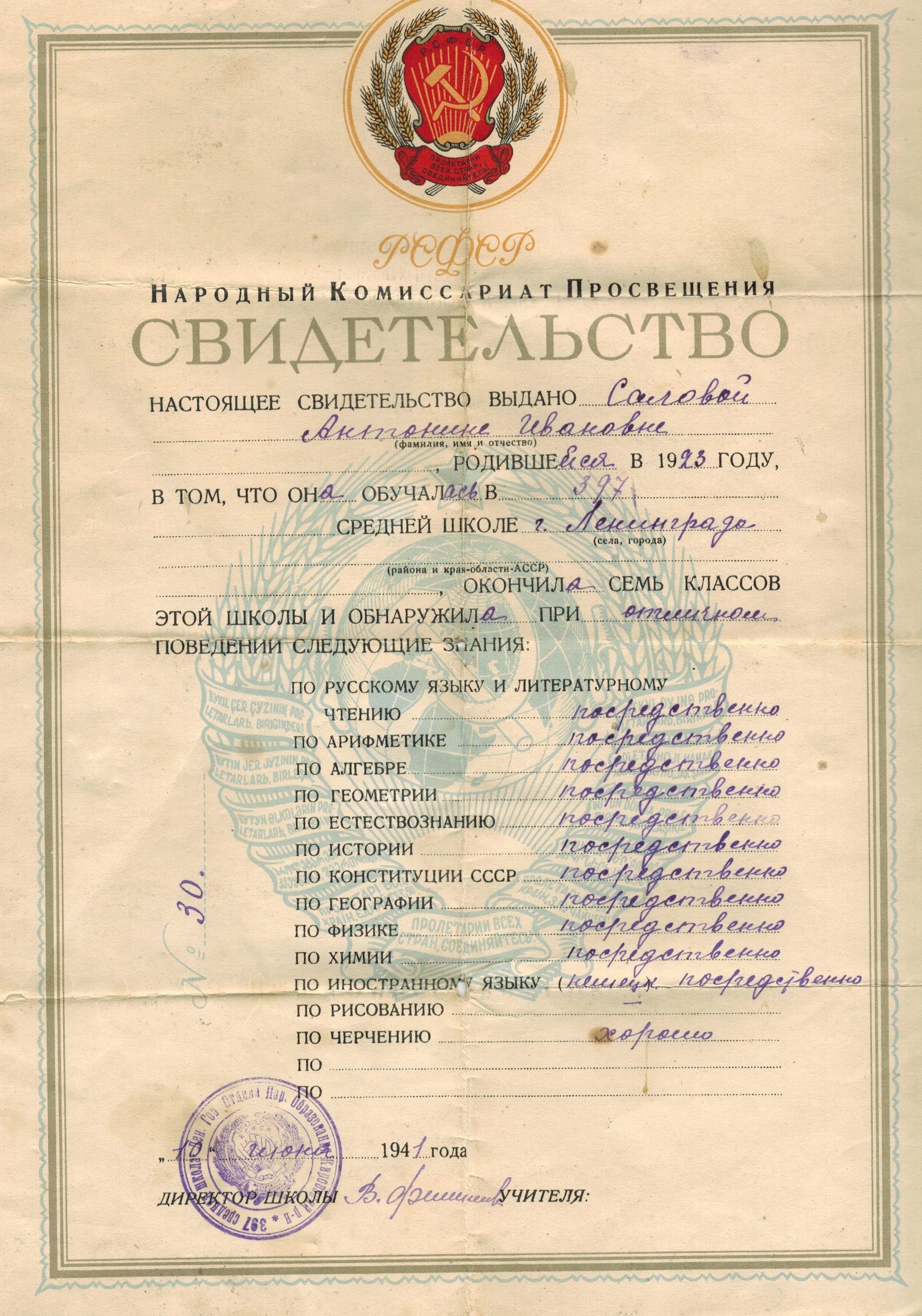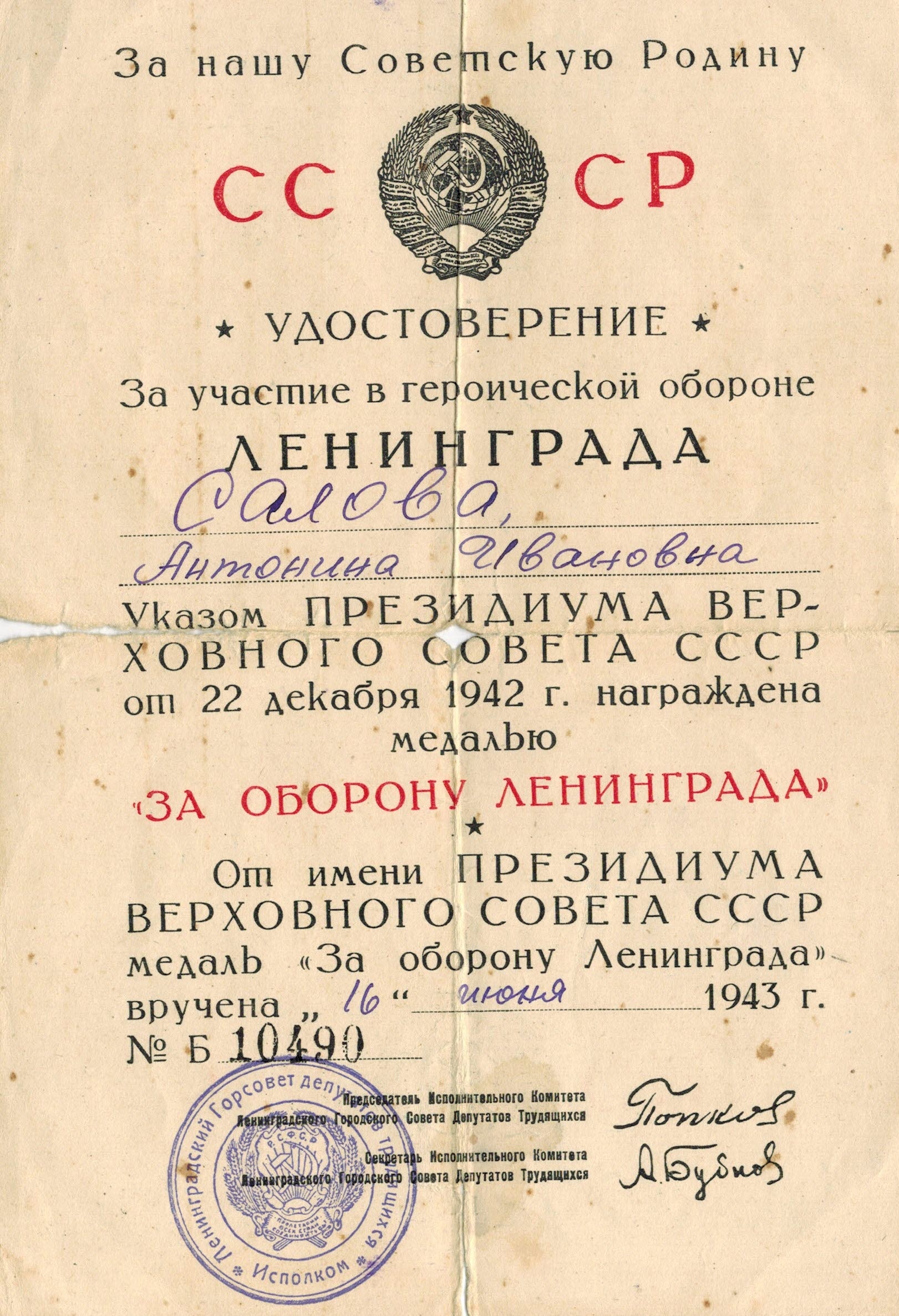 Бабушка родилась в Ленинграде в 1923г. Школу она закончила в июне 1941 года. Летом ушел на фронт ее папа - Иван Яковлевич Салов,и сразу погиб. Мама умерла от голода в блокаду. Бабушка сначала копала окопы на Пулковской высоте,затем добывала торф под Лугой. Она заболела тифом и ее положили в госпиталь,там и застала ее блокада. Несколько месяцев она работала в милиции,затем ее перевели в пожарную часть.Она тушила зажигалки на крышах и выезжала на пожары .Рассказывала,что тушила Бадаевские склады.В 1943 году ее направили в отряд минеров. Бабушка разминировала линию Монергейма,Пушкин,Павловск,Гатчину. После увольнения ее направили работать на Адмиралтейский завод.Бабушка прожила тяжелую но интересную жизнь.Горжусь ей!