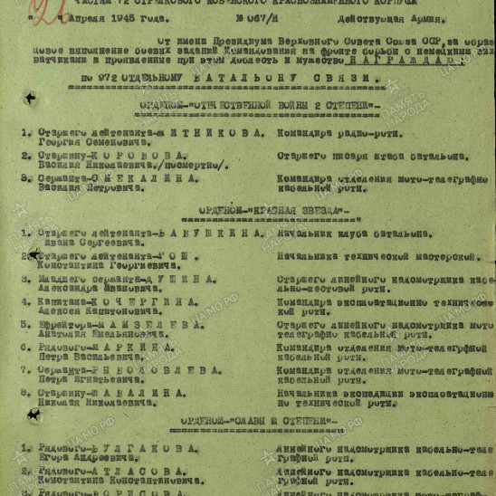 Мой отец - Самошин Николай Герасимович, 23.05.1923 года рождения, был призван на фронт Центральным РВК Воронежской области 15.10.1941 года. Воевал на Западном и 3-м Белорусском фронтах в 72 стрелковом корпусе 972 отдельного батальона связи 255 стрелковой дивизии в звании сержанта, должность - начальник радиостанции. Прошел всю войну, принимал участие в более 50 боевых действиях. За участие в героическом штурме и взятии Кенингсберга награжден медалью "За взятие Кенингсберга" (награда нашла героя только в сентябре 1978 года). 22.04.1945 г. представлен к награждению орденом "Красная Звезда". 26.04.1945 года награжден медалью "За боевые заслуги". В конце апреля 1945 года был переброшен в Сибирцево на Дальний Восток, принимал участие в 17 боевых действиях против японских империалистов в Монголии. 12 апреля 1946 года награжден медалью "За победу над Японией". Демобилизовался в 1947 году. За храбрость, стойкость и мужество, проявленные в борьбе с немецко-фашистскими захватчиками, награжден орденом Отечественной войны II степени.