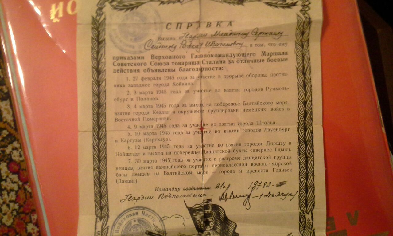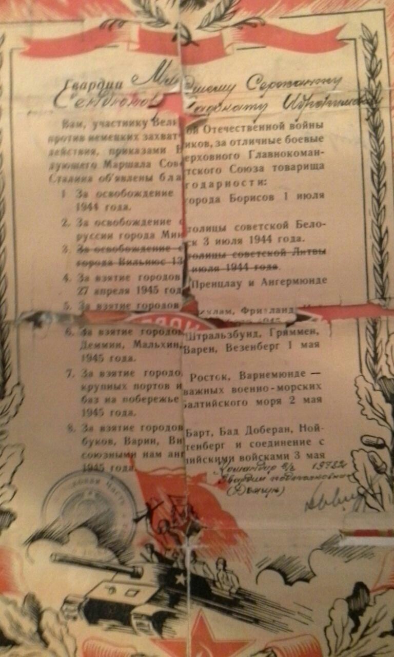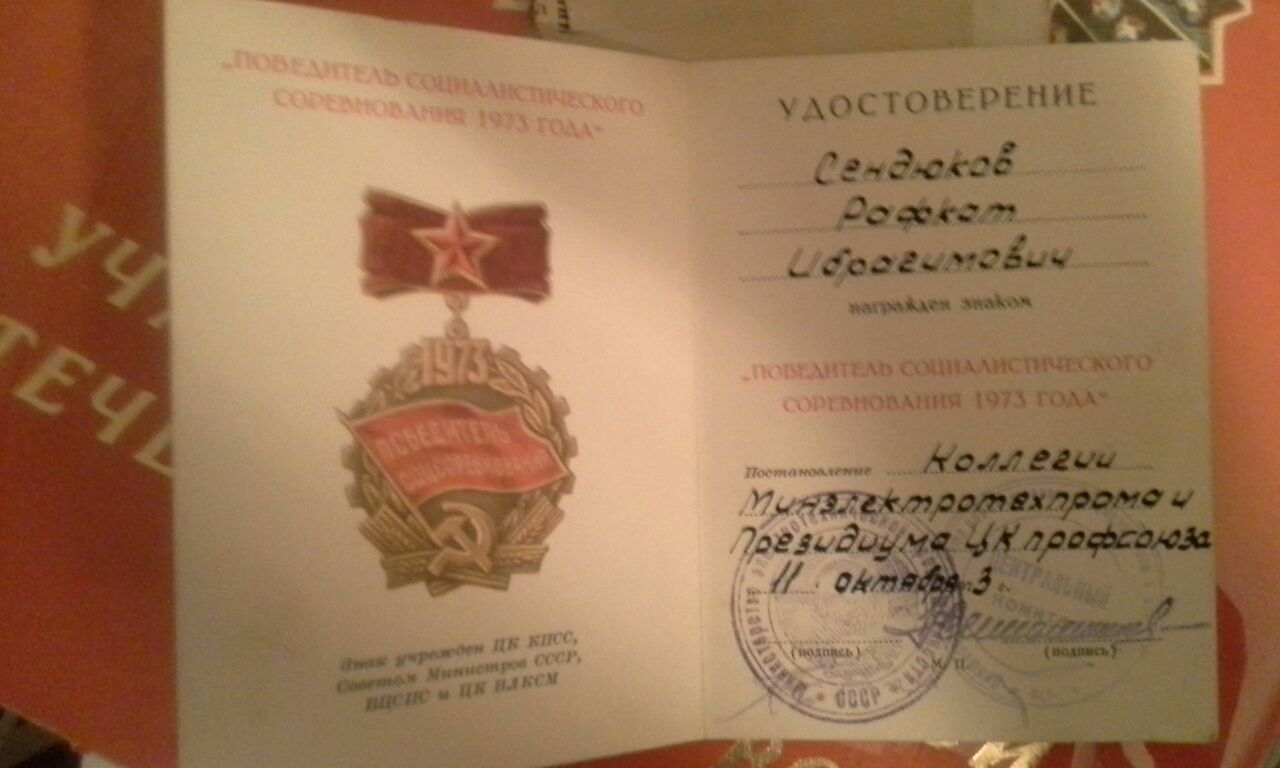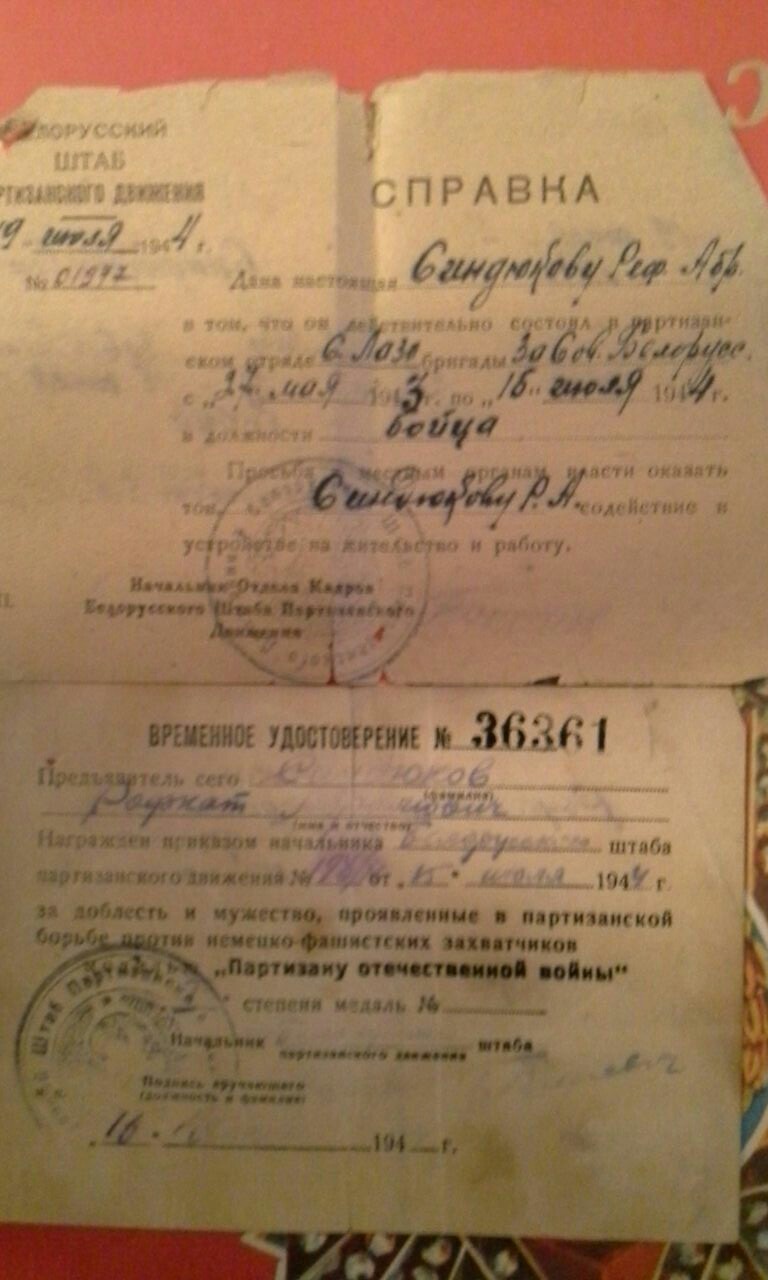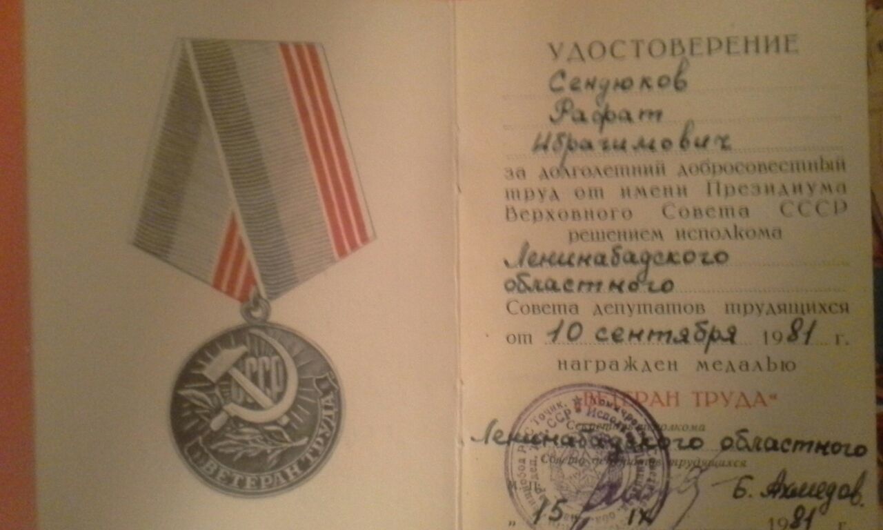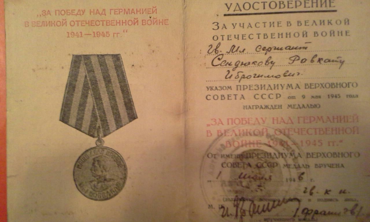 Сендюков Рафкат Ибрагомович родился в 1921года 6 июня в Ташкенте в районе Бешагач. Его отец Сендюков Ибрагим был прокурором и судьей. Его мама была первым секретарем по снятию паранджи в районе Бешагач города Ташкент. Он закончил 4 класса средней школы, и был очень грамотным, начитаным человеком. Еще не достигнув 18 лет стал работать в военкомате в поселке Шайдан Республики Таджикистан. Оттуда он был призван в ряды советской армии. Прослужив 2 года его отправили на фронт. В 1924 году в Белоруссии в селе Решилово он тяжело заболел брюшным тифом. И ему пришлось остаться в этом поселке где белорусские женщины лечили, ухаживали и прятали его от немцев в чулане. Когда он поправился его отправили в партизанский отряд, где он подрывал эшелоны, поезда, колонны грузовых автомобилей. Из воспоминаний мамы "Обвешившись гранатами они прошли к железной дороги где проходили эшелоны с немцами, закладывали взрывчатку и подрывали их"... У дедушки был очень красивый калографический почерк он писал много разных документов, справок и в тоже время ходил на задания чтобы разведать какие намерения у немецких войск. Когда Советская Армия пошла в наступление, его отряд частично присоединился к Армии и дошел до Чехословакии и Праги, где он и встретил победу Советской армии над немцами. В семье их было трое братьев, Махмуд и Рафик Сендюковы. Все они от начала и до конца прошли Великую Отечественную Войну и остались живы. 9 мая 1945 года не дождавшись своих сыновьев умерла его мама, от радости одержаной победы. Вернувшись с фронта дедушка работал в военкомате, на свето-техническом заводе в красильном цеху, восстанавливал памятники "Пионеру и Пионерке" и Ленину. После имея юридическое образование стал адвокатом и защищал военные интересы простых солдат и офицеров. У него было очень много наград и медалей. Дедушка был очень скромным, хорошо воспитанным человеком. Он очень любил читать и знал 7 разных языков, таджикский, узбекский, русский, киргизский, турецкий, татарский, включая латынь в совершенстве. После окончания войны он вернулся в Таджикистан где встретил нашу бабушку Абубикерову Таскиру Якубовну с которой прожил 52 года. В браке родились четверо детей, два мальчика и две дочери. Дедушка вырастил и воспитал их окружая заботой и теплотой. Дали всем высшее образование. И в 70 лет уже имел вместо внуков и одиннадцать правнуков..Он редко вспоминал о годах войны и имея такое большое количество наград, практически никому не рассказывал о своих подвигах. Уже в возрасте когда ему было за 70 лет к нему приезжали из Шайданского городка где он когда то работал в военкомате, брали интервью, расспрашивали как он прошел всю войну и заслужил такие редкие награды и медали. Позже про него была написанна книга о его биографии на таджикском языке. Дедушка не дожил до 80 лет полгода и умер 11 января 2001 года. У деда осталась мечта которую он так и не успел осуществить... Он хотел поехать в Белоруссию в поселок Решетово и поклониться тем женщинам которые тогда спасли ему жизнь...