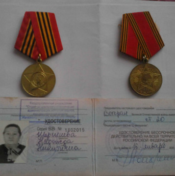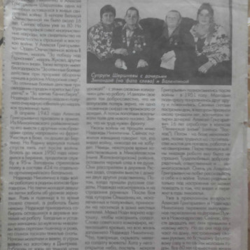 Хочу поделиться историей своей семьи, а именно рассказать про свою бабушки и своего дедушку. Шернев Алексей Григорьевич родился 05.10.1925г. в с. Волково Железногорского р-на Курской обл., Шершнева Надежда Никитична родилась 14.09.1926г. в пос. Яблоновский Железногорского р-на Курской обл. В начале Великой Отечественной им было около 16 лет. В апреле 1943 года дедушку (Алексей Григорьевич) призвали армию. Из Михайловского райвоенкомата его вместе с другими новобранцами сразу направили на фронт. Учавствуя в боях, он дошел до Берлина. На Родину вернулся только спустя пять лет после войны. Вплоть до июня 1950 года находился в Берлине, продолжая службу в 95-м Западном стрелковом полку в составе 424-го отдельного артиллерийского батальона. Бабушка (Надежда Никитична) в годы войны работала в родном колхозе бригадиром. На плечи молодой девушки легли заботы об урожае зерновых. Рожь и пшеница в то время стояла стеной, а работать было некому. Ей приходилось собирать оставшихся в деревне жителей на работу. Голодные и уставшие женщины да мужчины-инвалиды жали серпами пшеницу и рожь, на спинах таскали тяжелые снопы. Ночами молотили и веяли, а утром возили на заготовку в Дмитриев. Работали от зори до темной ночи за трудодни, которых за год имели до полутора тысяч, но ничего на них не получали – платить зарплату людям в том время было нечем. «Боже милостливый, помоги нам убрать урожай!» - с этими словами колхозники шли на работу. И делали свое дело так добросовестно, что не допускали потерь зерна, ни одна сложенная скирда не промокла от дождей. А потом лопатами закапывали поле для нового посева. Знали, что их труд нужен фронту. По рассказам бабушки немцы, некоторое время хозяйствовавшие в Михайловском (ныне Железногорском) районе Курской области, оставили черный след в ее душе. Они расстреляли в деревне Рясник её деда, спалили вместе с домами двух других родственниц. Потом, когда пришли русские солдаты, она насмотрелась и на страдания раненных. После боя под хутором Ольшанец их, искалеченных и полуживых, приносили на носилках в дома местных жителей. Мама моей бабушки варила картошку, чтобы накормить солдат. Слова советского командира, истекающего кровью, на всю жизнь запомнила бабушка: «Что, товарищи, скрывать: нелегко солдату воевать! Хата у него – открытое небо, постель – мокрая солома. Хотел закурить, пустить дымок– а кисет намок! На мою могилу никто не придет. Только раннею весною соловей запоет». Бабушка и Дедушка познакомились после войны в 1951 году. Они сразу понравились друг другу и поженились. Воспитали четырех замечательных дочерей и все 62 года совместной жизни супруги Шерневы прожили в согласии. Дедушка (Алексей Григорьевич) награжден: Орденом Отечественной войны II степени, медаль «За победу над Германией», медаль «Жукова» и другие медали и знаки. Также имеет благодарности: «За отличные боевые действия при прорыве обороны немцев в районе Мазурских озер», «За отличные боевые действия при овладении городами и крепостью Грайденц», и «За взятие Кенигсберга». Бабушка (Надежда Никитична) получила юбилейную медаль, как труженица тыла. Спасибо родные и любимые за мирное небо над головой!!
