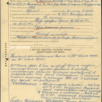 167 гв. С.П.1 Московская Гв.Мото-Стр.Дивизия,11 гв. Армия,3 Белорусский фронт.Медаль «За отвагу». Дата подвига: 22.06.1944.
