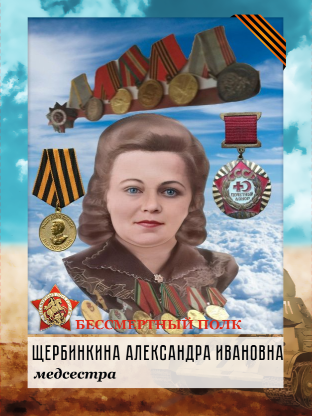 Наша бабушка - Адамова (Щербинкина) Александра Ивановна (9.04.1924 - 16.11.1997) г.г. Место службы: 2-й БелФ, ЭГ 1243, ФЭП 77). Родилась в селе "Башкино" Александровского р-на (на момент рождения) Ивановской области 9 Апреля 1924г. (т.к Владимирская область появилась на карте лишь 14.08. 1944-го, путём выделения территорий из Ивановской, Горьковской и Московской областей). Родилась в семье Ивана Прохоровича и Прасковьи Михайловны Щербинкиных, в семье была самой старшей(всего у Прасковьи Михайловны и Ивана Прохоровича было 7-мь детей). Сёстры: Александра Ивановна, Надежда Ивановна и Нина Ивановна. Братья: Александр Иванович, Сергей Иванович, Николай Иванович старший(умер в раннем возрасте) и Николай Иванович младший. С 1940 по1942-й годы бабушка училась школе медицинских сестёр при Институте Склифосовского в Москве. Была направлена на фронт для прохождения воинской службы: 23.06.1942 года: эвакуировала раненных бойцов с поля боя, оказывала медицинскую помощь, сдавала кровь, а если бойца спасти не удавалось - осуществляла его временное захоронение. Демобилизована: 15.10.1946г. Закончила службу под "Кёнигсбергом", где и познакомилась с будущим 1-м мужем Адамовым Петром Владимировичем. Победу встретила в Польше, куда после штурма Кёнигсберга повернул войска Константин Константинович Рокоссовский.