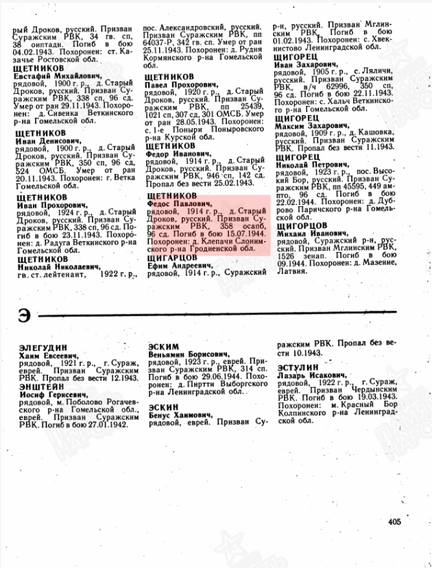 Щетников Федос Павлович, родился в 1914 г. Жена: Щетникова Фёкла Емельяновна Дата и место призыва: _ _ 1943 г., Суражский РВК, Брянская обл., Суражский р-н Погиб в бою 15.07.1944г. Воинская часть 358 отдельный саперный батальон, 96 Гомельская дивизия Воинское звание рядовой, красноармеец Боевые действия в составе: 96 сд (III) 11.07.1944 - 18.07.1944 Место захоронения Братская могила погибших в годы Великой Отечественной войны в 1941-1944 г.г. воинов Советской Армии - Беларусь, Гродненская обл., Слонимский р-н, д. Клепачи; Белорусская ССР, Барановичская обл., Слонимский р-н, д. Клепачи, восточнее, 150 м, около дороги, могила № 2