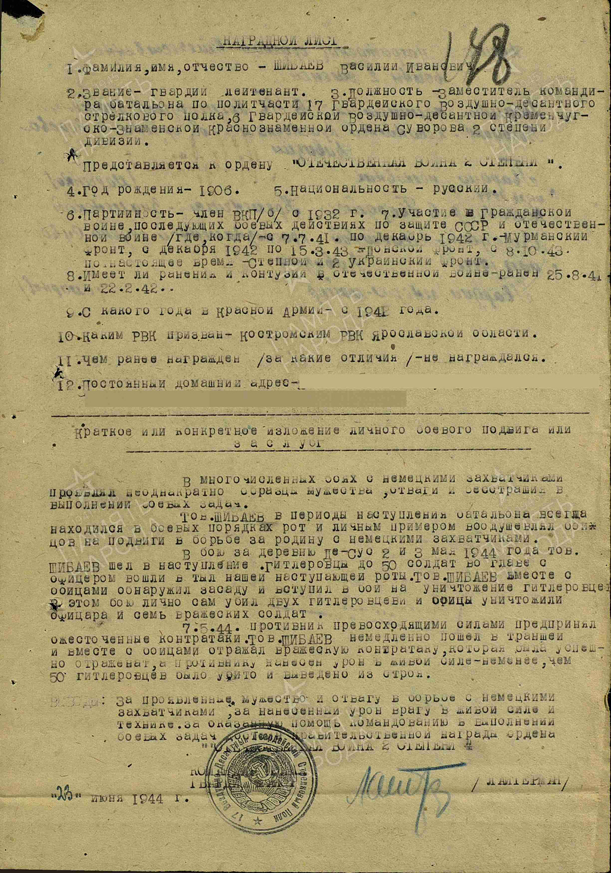 Шибаев Василий Иванович родился 28.02.1906 в Костромской области, Красносельском районе, Захаровском с/с, деревне Залужье. В школе учился очень хорошо, был награжден за успехи в учебе грамотой с изображением царской семьи. Был призван в Костроме 28.10.1928г в звании рядового. Службу в рядах Советской армии завершил в звании гвардии старший лейтенант. Войну прошел в составе 2 Украинского фронта Воинской части 17 гвардейского воздушно-десантного полка 6 гвардейской воздушно-десантной дивизии. Был разведчиком. Великую Отечественную войну прошел с первого до последнего дня. Воевал в составе 2 Украинского фронта Воинской части 17 гвардейского воздушно-десантного полка 6 гвардейской воздушно-десантной дивизии. Был разведчиком. Участвовал в обороне Сталинграда. Был участником Курской битвы. Прошел с боями всю Европу. Освобождал Молдавию, Югославию, Венгрию, Чехию. После войны работал начальником рыбной базы в Костроме. Был женат на Вере Федоровне Шибаевой, в девичестве Величко (родом с Украины), воспитал двоих сыновей Александра и Сергея. Умер в январе 1974 года похоронен на Костромском кладбище.