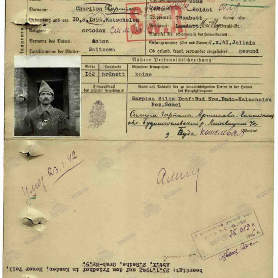 Харитон Антонович родился 10 августа 1894 года в Гомельской области.Был призван на фронт в 1941 году Буда-Кошелевским РВК.7 октября 1941 года попал в плен городе Ельня.Находился в Шталаге XIII В городе Вайдене.Умер 23 января 1942 года в плену от болезни.Похоронен в Каадене (новая часть кладбища).