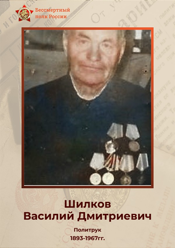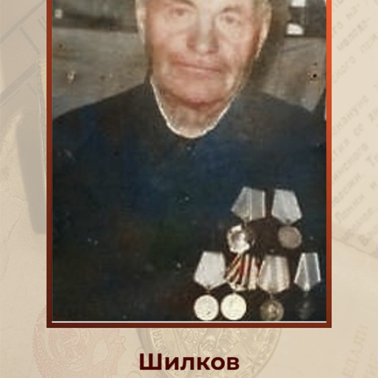 Мой дед - Шилков Василий Дмитриевич пошел добровольцем на фронт 24 августа 1941 г. Было ему тогда уже 48 лет. Призывался Парфеновским райвоенкоматом Алтайского края. Участвовал в боях на Ленинградском фронте в составе 8 стрелковой роты 1240-го стрелкового полка 372-й стрелковой дивизии. Был награжден медалью "За боевые заслуги". Из наградного листа: "13 января 1943 г. в районе села Федосеевки Ленинградской области политрук Шилков взял ручной пулемет, выполз на 40-50 метров вперед роты и открыл ураганный огонь по немцам, при этом уничтожил до двух десятков немцев. В этом же бою был ранен. На фронте проявил личную отвагу." Награжден многими наградами - орденом Ленина, медалью "За оборону Ленинграда", "За боевые заслуги", "За победу над Германией". Был председателем колхоза имени Буденного (п. Кондратьевка Алейского района) Годы жизни деда - 1893 - 1967 г.г.