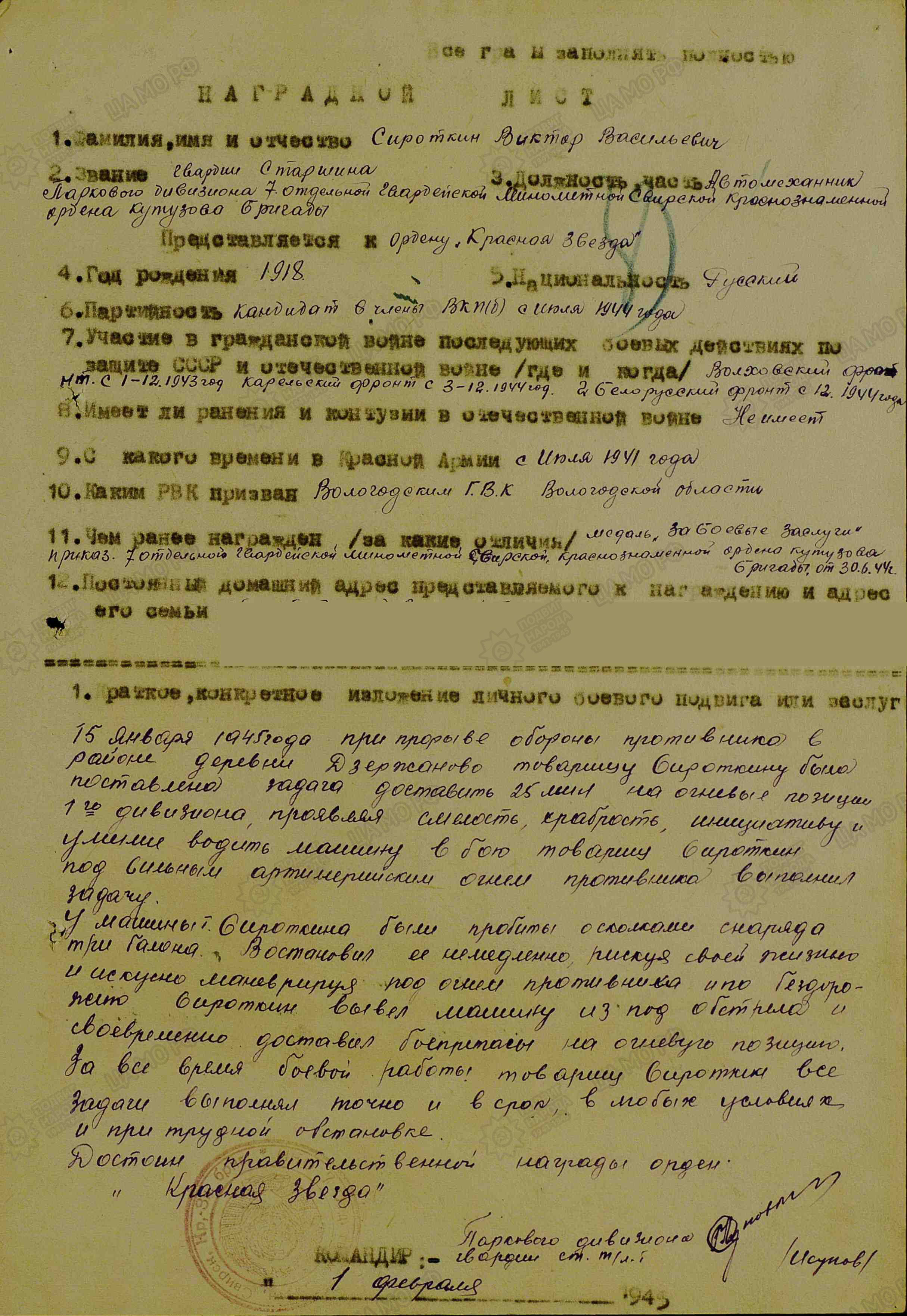 обстрела и своевременно доставил боеприпасы на огневую позицию.За все время боевой работы товарищ Сироткин все задачи