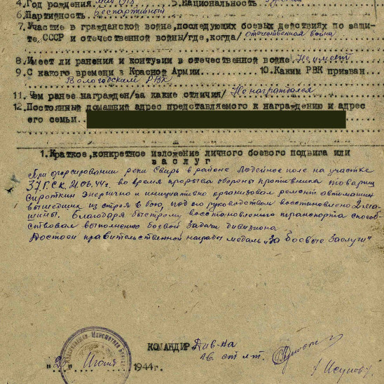 Из наградного листа к Ордену Красной Звезды: «От имени