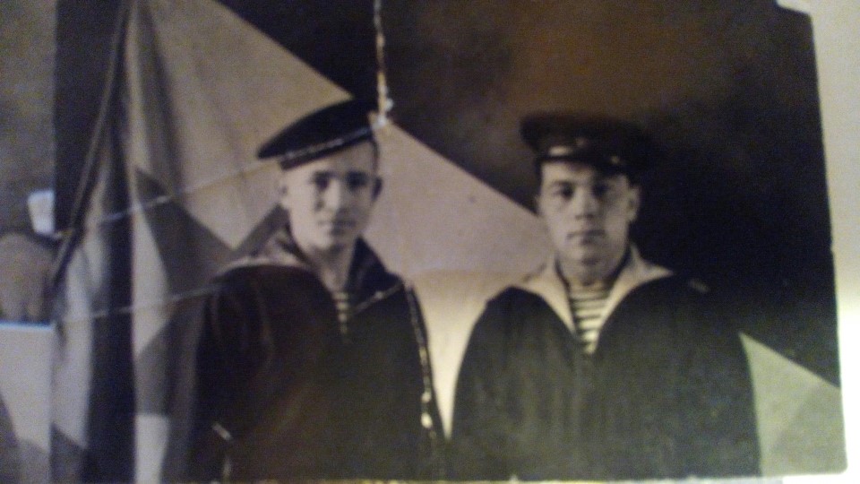 сфотографирован перед развернутым знаменем корабля Краснознаменного Эм "Войков"