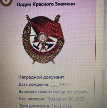 За период службы неоднократно награждался правительственными наградами,но своего первого боевого ордена "Красная звезда"был удостоен в декабре 1944 года-за образцовое выполнение боевых заданий Командования на фронте в борьбе с немецкими захватчиками и проявленные при этом доблесть и мужество.