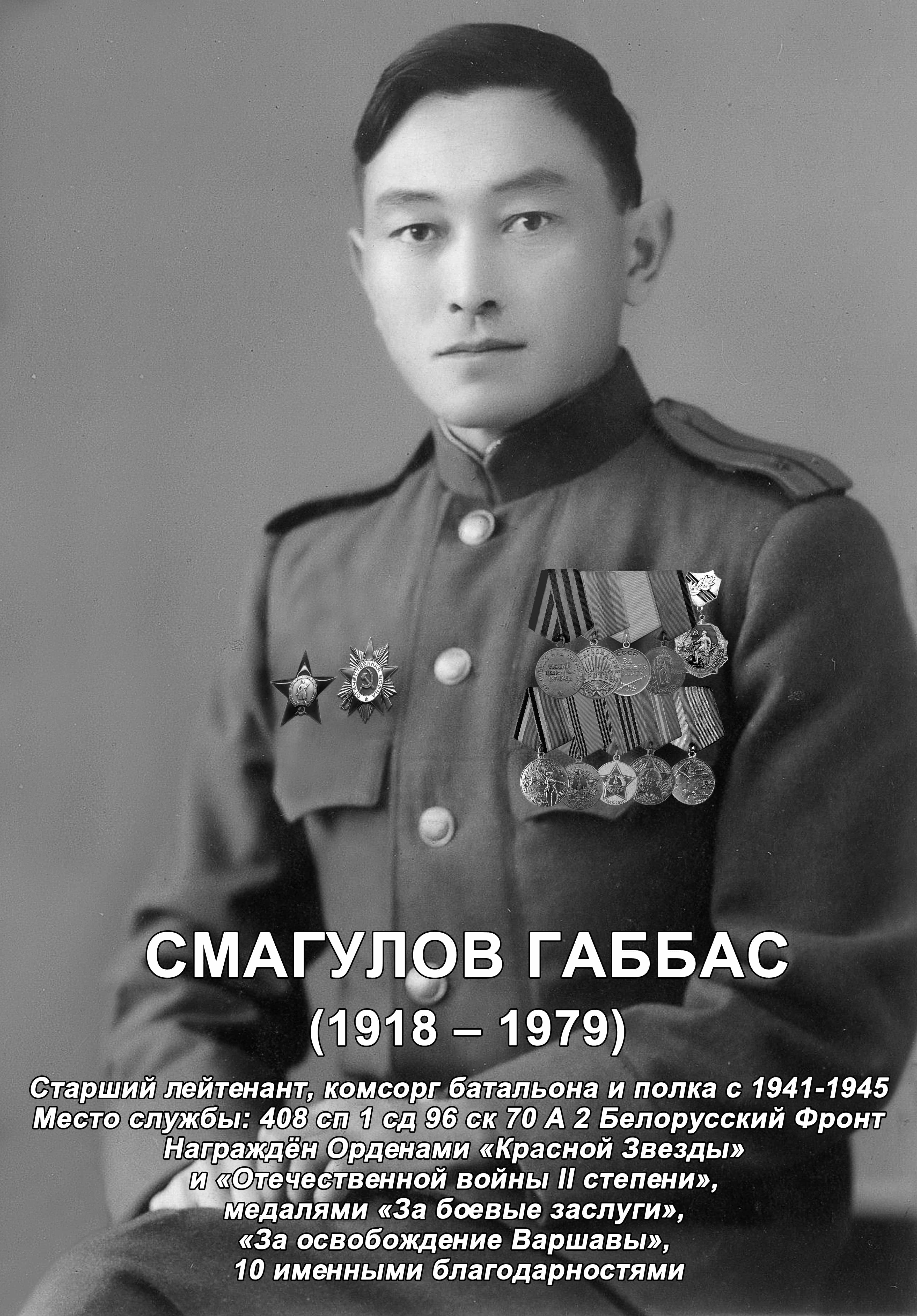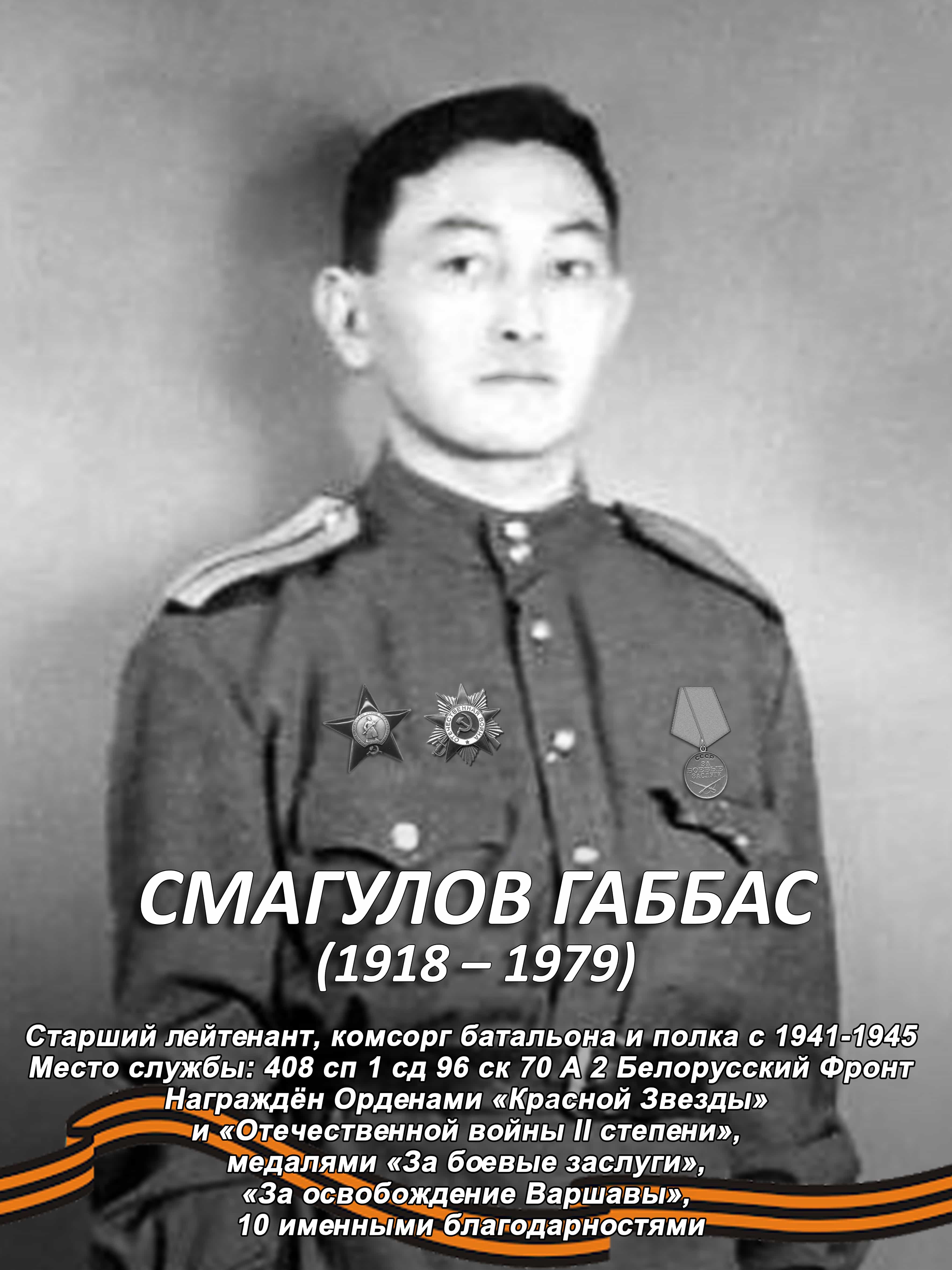 Смагулов Габбас был призван Джамбульским РВК в ряды Советской Армии 8 октября 1941 г. и закончил войну в мае 1945 г. в Австрии в звании старшего лейтенанта, в должности комсорга батальона и полка.