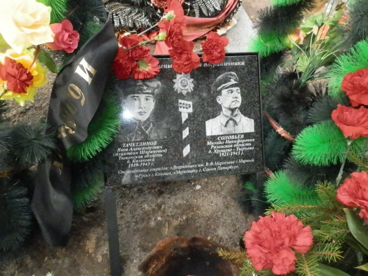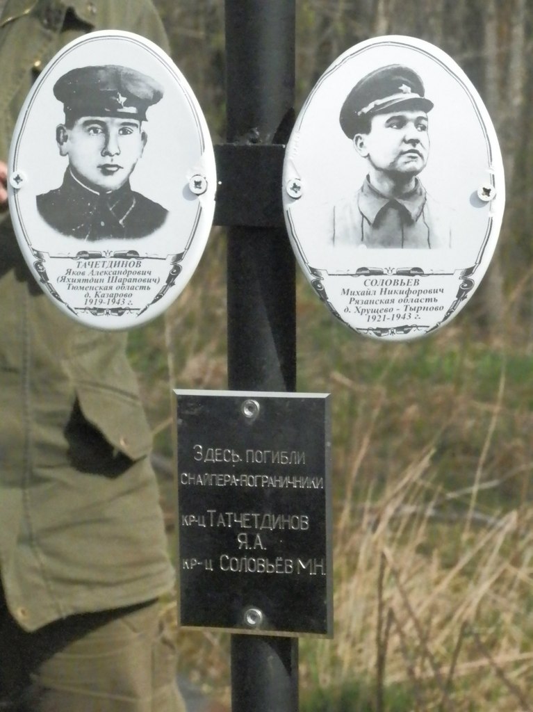 «Здесь похоронены снайпера-пограничники Тайчитдинов Я.А. — истребил 16 фаш., Соловьёв М.Н. — истребил 93 фаш.»