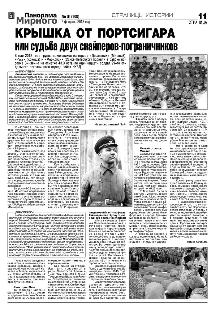 В мае 2012 года группа поисковиков из отряда «Десантник» (г. Мирный Архангельской области), «Русь» (г. Коноша Архангельской области) и «Меридиан» (г. Санкт-Петербург) подняли в районе посёлка Синявино на отметке 43,3 останки одиннадцати солдат 99-го отдельного пограничного отряда войск НКВД, среди них были Михаил и Яков.