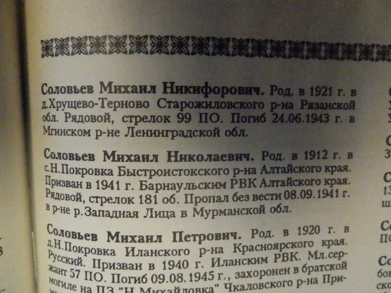 Соловьев Михаил Никифорович, 1921 г.р., родился в деревне Хрущёво-Тырново (в документах значится как - Хрущево-Терново) Старожиловского р-на Рязанской области.
