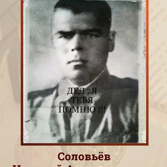 Мой , дед,Соловьев Николай Александрович, ком.пулеметного расчета в/ч 67661 старший сержант призван на фронт Шольским РВК Вологодской области в феврале 1942года, умер от ран 23 февраля 1945года.