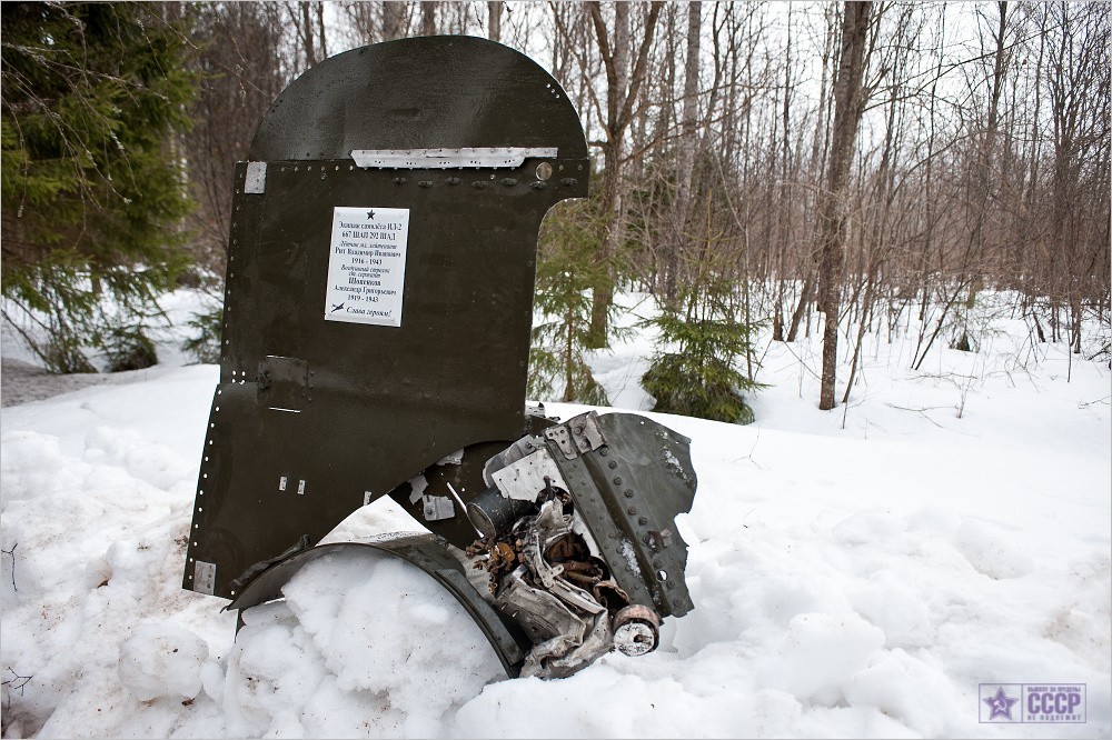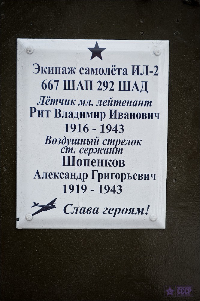 Место падения одного из самолётов, принявших участие в описанном воздушном бою, в общем-то, было известно довольно точно, местные жители, бывшие очевидцами воздушного боя или слышавшие о нём могли указать примерный район падения самолёта. Но сильно заболоченная и малопроходимая местность делали поиски погибшего экипажа очень сложными. После удара о землю самолёт ушёл на глубину около 10 метров, там разломился и, похоже, пострадал от взрыва сдетонировших неизрасходованных бомб. С течением времени воронку с останками машины и экипажа затянуло водой и болотным торфом, а поверху вырос целый молодой лесок. Целых 9 попыток подъёма упавшего в болото Ил-2 совершил поисковый отряд «Демянск» и лишь последняя оказалась результативной: среди обломков бронекорпуса нашлись тела лётчика и стрелка из состава экипажа штурмовика Ил-2. В карманах гимнастёрки лётчика поисковики обнаружили многочисленные документы, однозначно подтверждавшие личности обоих героев, в том числе часы, которые остановились в 2 часа 3 минуты... Их имена:лётчик — младший лейтенант Владимир Иванович Рит (отчество в документах может быть указано как Павлович или Петрович) из Ленинградской области, посёлок Тарковичи.стрелок — старший сержант Александр Григорьевич Шопенков из Орловской, ныне Брянской области (Комаричский район, с. Шарово).