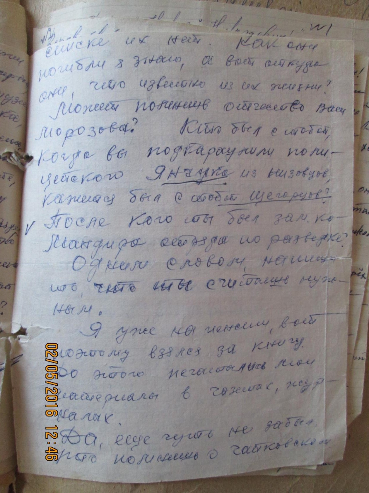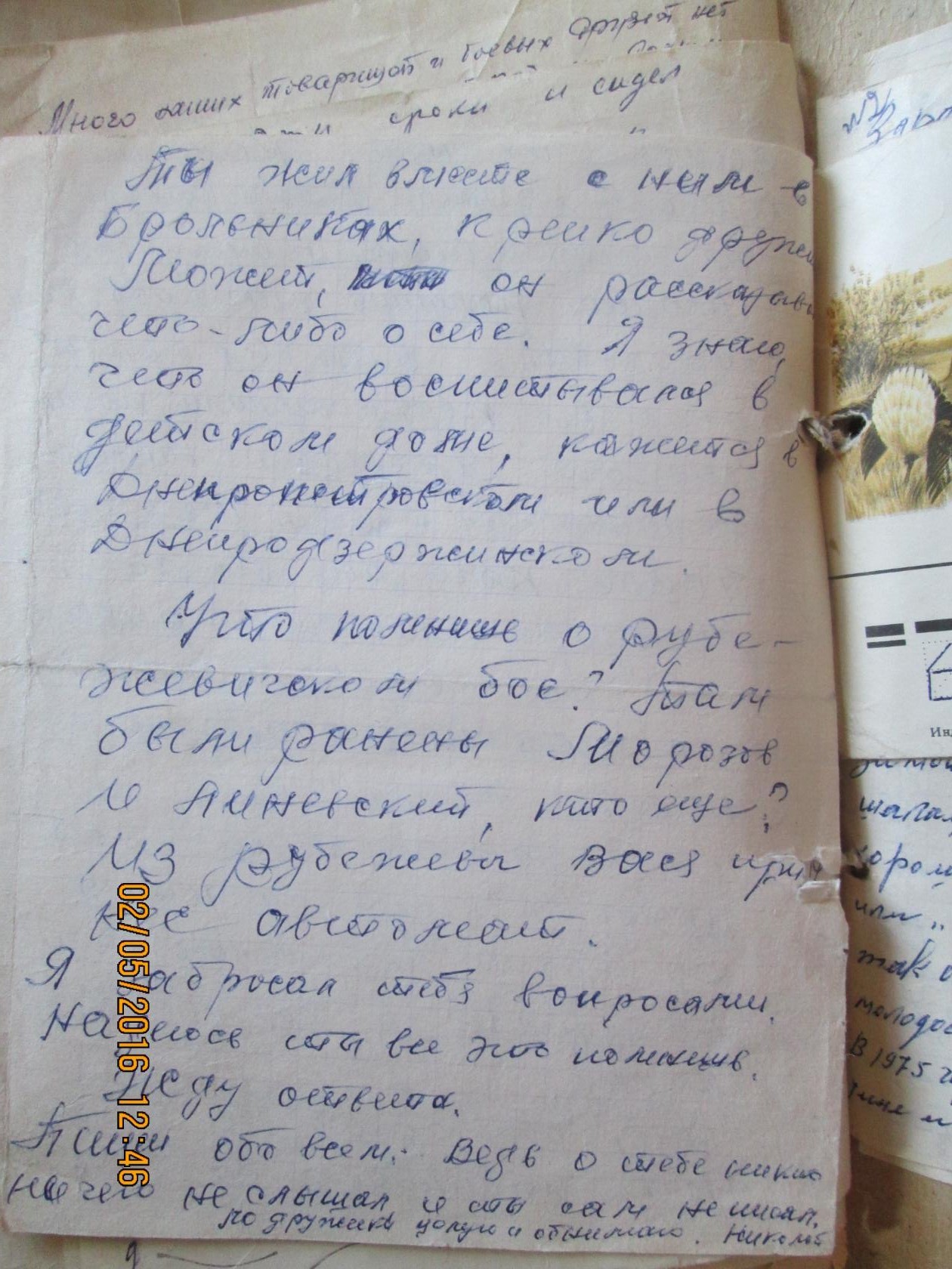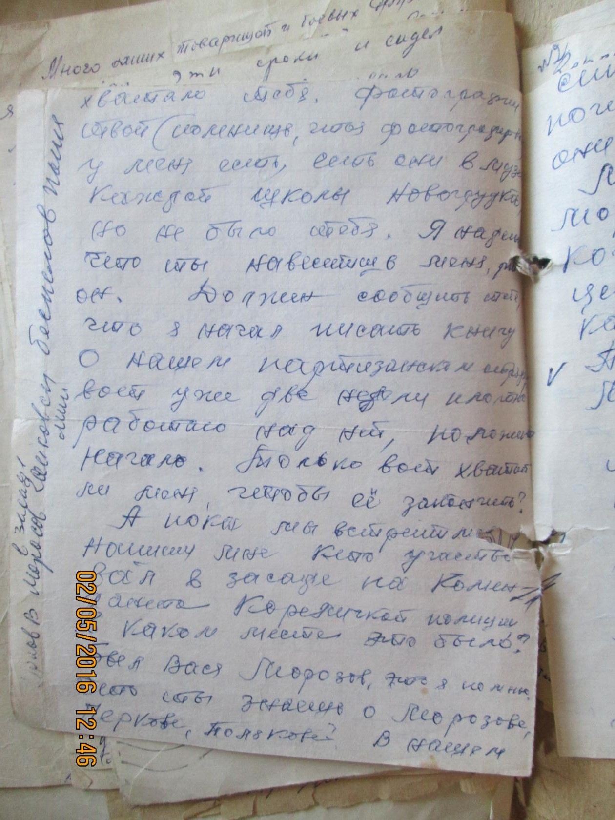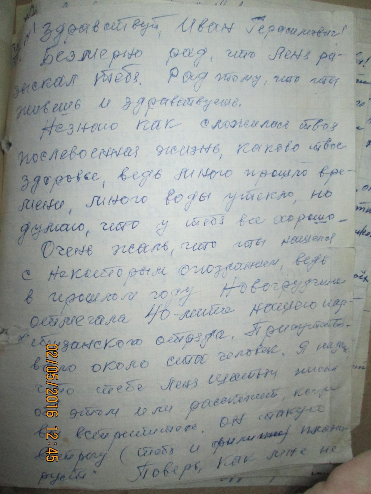 В одном из своих писем Стрекаловских И. Г. от 03.02.1983 года Н. Гребенкин пишет: " Здравствуй, Иван Герасимович. Безмерно рад, что Леня Шестьян разыскал тебя. Рад тому, что ты живешь и здравствуешь. Не знаю,как сложилась твоя послевоенная жизнь, каково твое здоровье, ведь прошло много времени, много воды утекло, но, думаю, что у тебя все хорошо. Очень жаль, что ты нашелся с некоторым опозданием, ведь в прошлом году Новогрудчина отмечала 40-летие нашего партизанского отряда. Присутствовало около 100 человек. Я надеюсь, что тебе Леня Шестьян писал об этом или расскажет, когда вы встретитесь. Он такую встречу (тебя и Филиппа Пожар) планирует. Поверь, как мне не хватало тебя. Помнишь, что фотографии твои у меня есть, есть они в музеях каждой школы Новогрудки, но не было тебя. Я надеюсь, что ты навестишь меня. Должен сообщить, что я начал писать книгу о нашем партизанском отряде. Вот уже 2 недели плотно работаю над ней, положено начало. А пока мы встретимся, напиши мне кто участвовал в засаде на коменданта полиции, в каком месте это было. Был Вася Морозов, это я помню. Что ты знаешь о Морозове, Перкове, Полякове? Кто был с тобой, когда вы подкараулили полицейского Янчука из Низовцов? Кажется был с тобой Щегорцов. После кого ты был командиром отряда по разведке? Что помнишь о Чайковском?. Ты жил вместе с ним в Брольниках, крепко дружил. Может он рассказывал что-либо о себе? Что помнишь о Рубежевичском бое? Там были ранены Морозов и Линевский. Я уже на пенсии, вот поэтому взялся за книгу. До этого мои материалы печатались в газете и журналах. Забросал тебя вопросами, надеюсь, ты все это помнишь? Жду ответа. Пиши обо всем, ведь о тебе никто не слышал, а ты сам не писал. Целую и обнимаю, Николай."