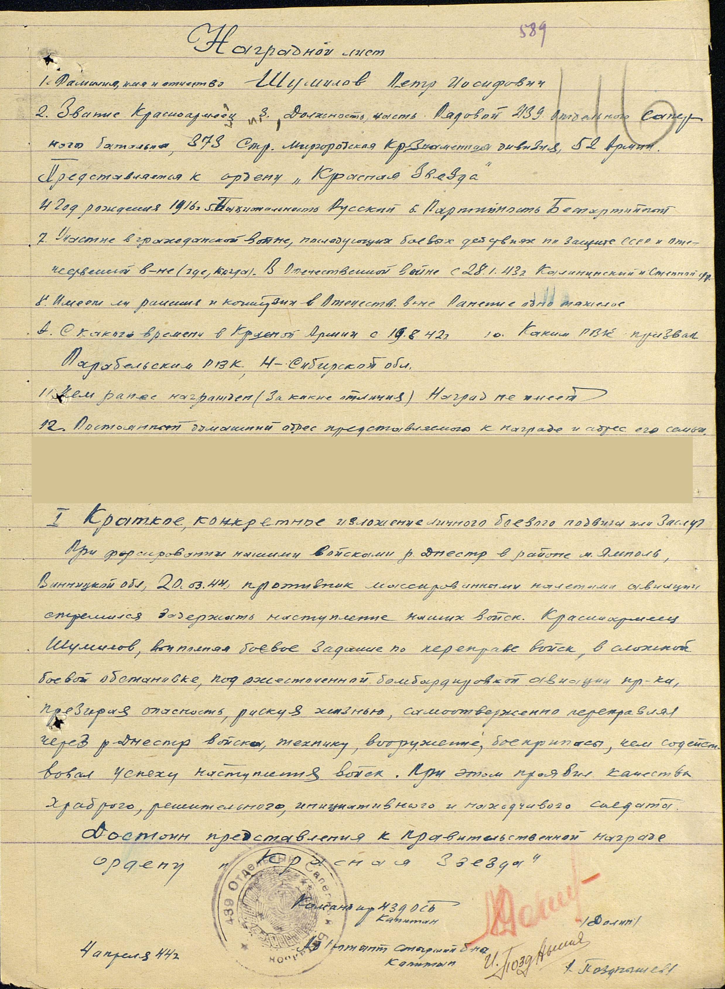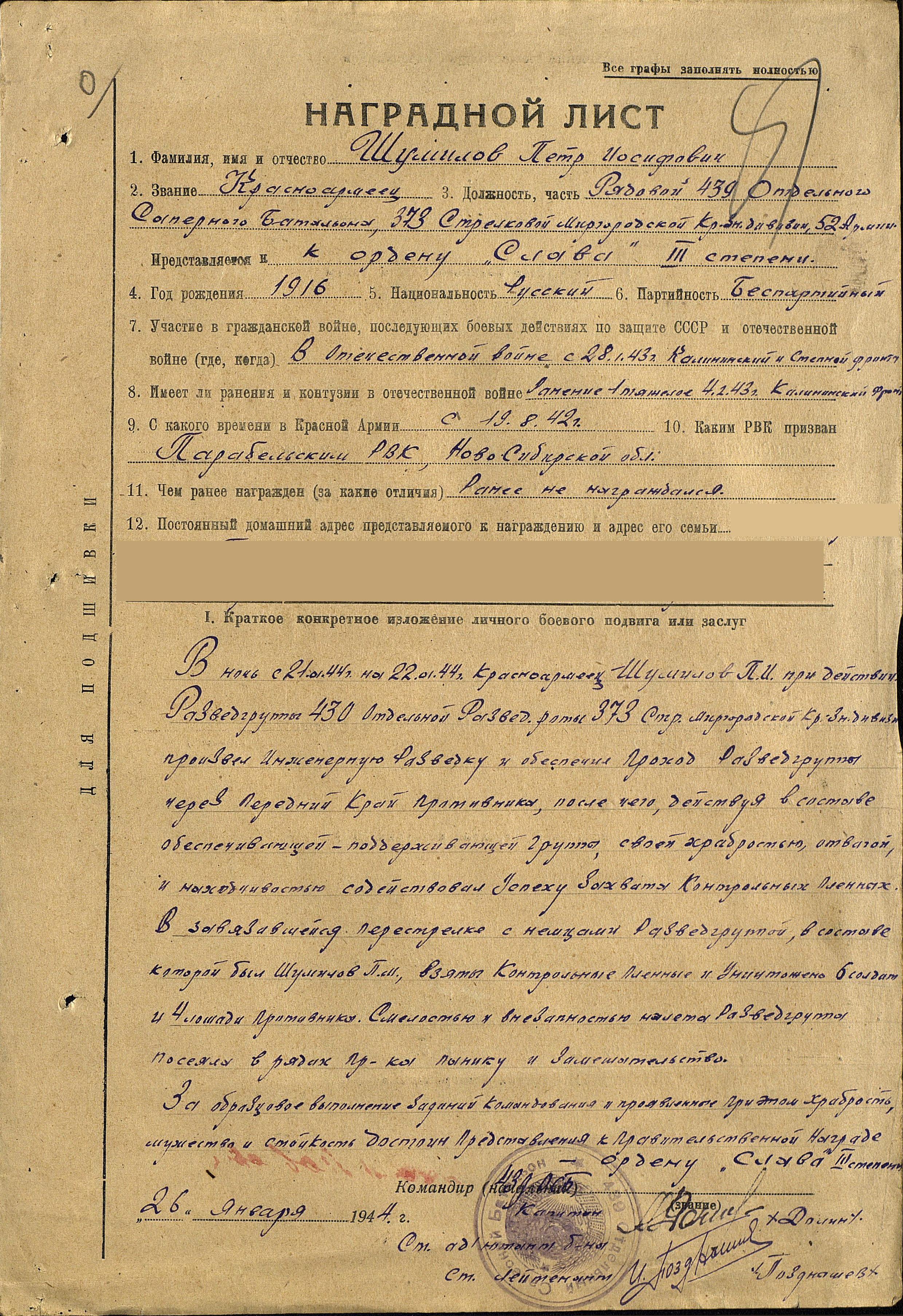 дивизия была награждена орденом Красного Знамени.1944В январе 1944 года Шумилов Петр