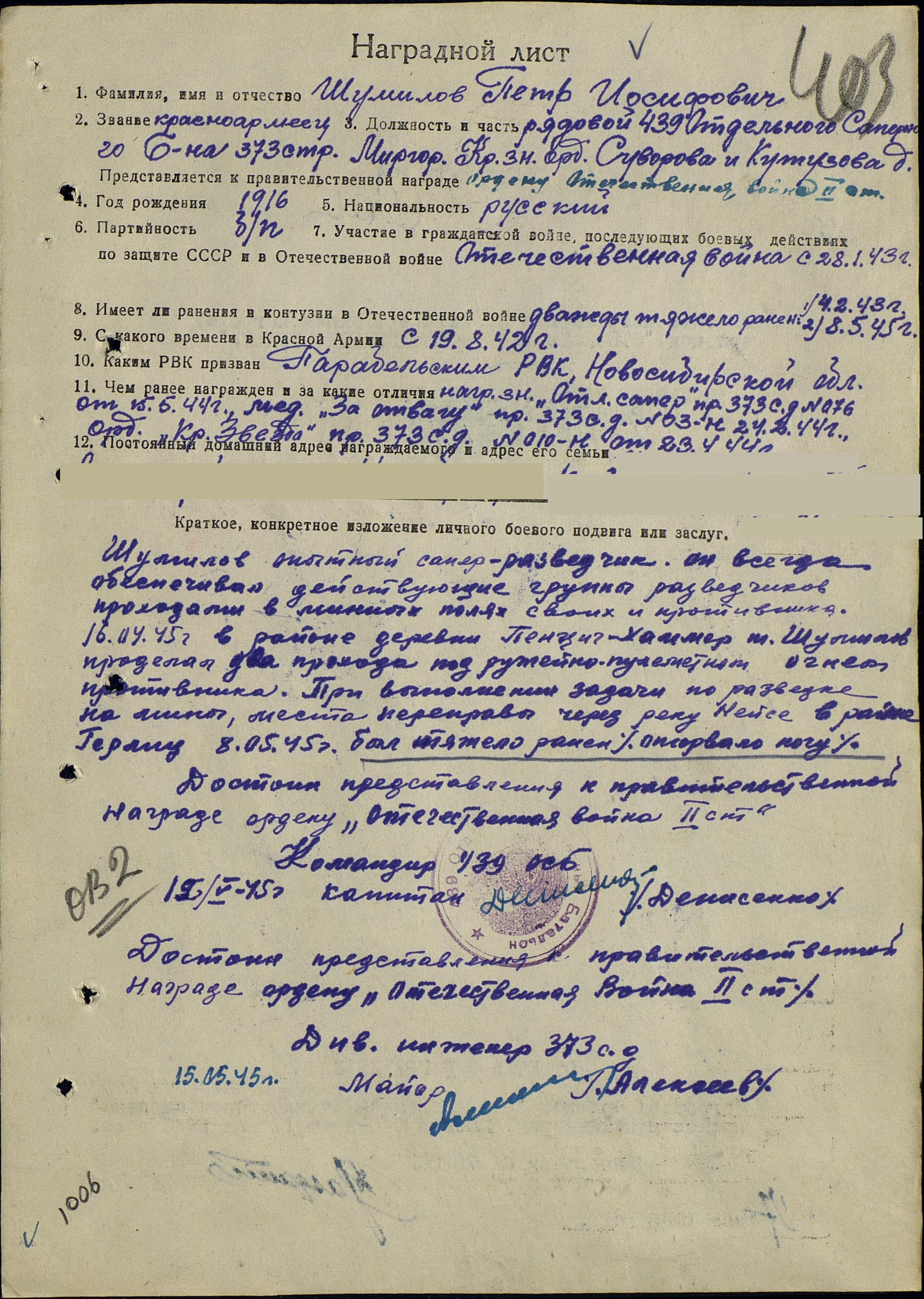 реку Нейсе в районе Гёрлиц 8.05.1945г. был тяжело ранен (оторвало ногу).Орден