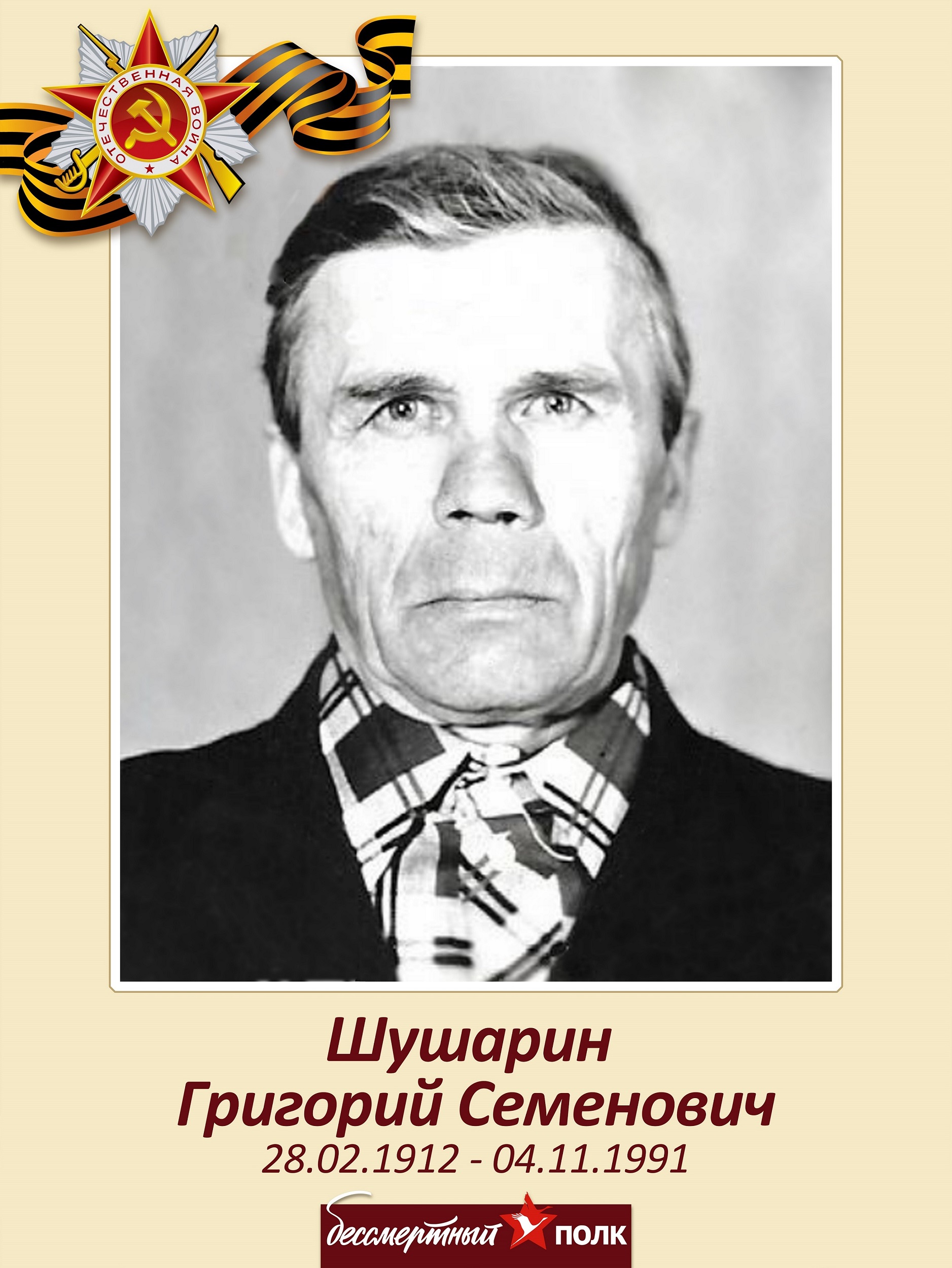 Мой дед, Шушарин Григорий Семенович, родился 28 февраля 1912г.р., в с. Нижние, Куртамышского района, Челябинской области. Был призван в ряды советской армии в 1941 года в звании красноармеец, а потом ефрейтор. За Боевые заслуги мой прадедушка был награжден Медалями: «За боевые заслуги» в 1943 году, «За отвагу» в 1944 году и Орденом Отечественной войны II степени в 1986 году. Он воевал в Витебской области в конной артиллерии. Послевоенное время он трудился на благо государства. Подтверждением заботы родного государства к рядовым труженикам села явилось награждение прадеда Орденом Трудового Красного Знамени. Мой прадед прожил 79 лет. Он умер 4 ноября 1991 года.